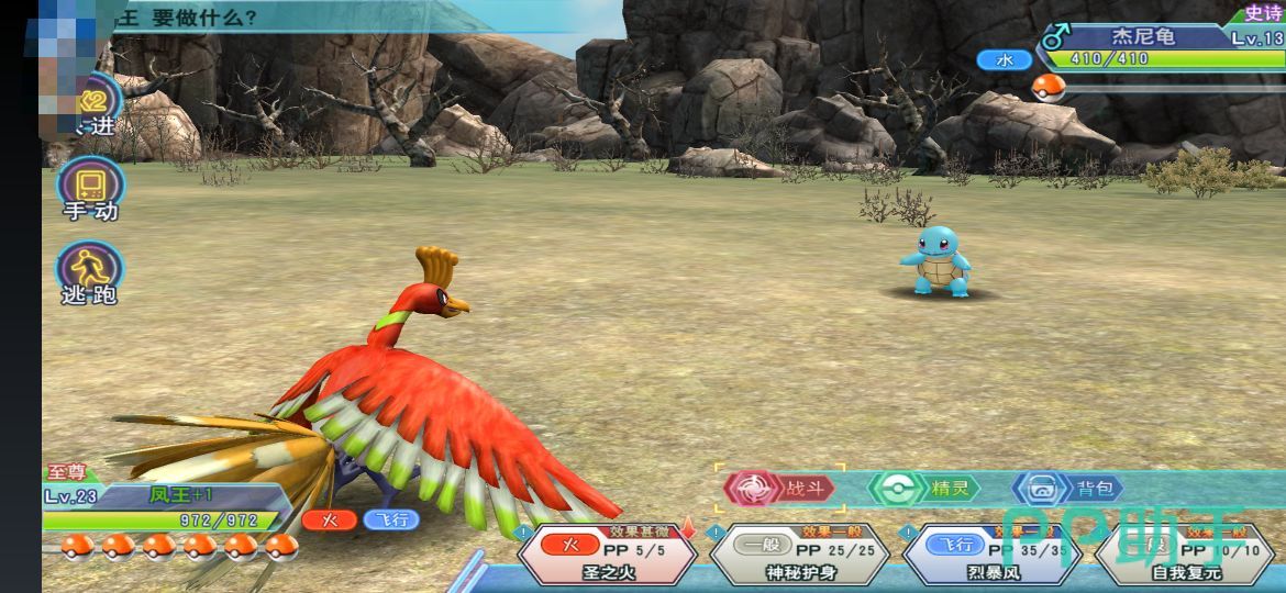 走进草丛,碰到杰尼龟就可以进入战斗界面了,玩家们可以派出等级比较低(大概在5、6级)的精灵与之对抗,慢慢消耗血量,然后使用高级捕捉球就可以了,也可以用低级捕捉球多次捕捉。血量越低越好捕捉,不过注意不要打死了。