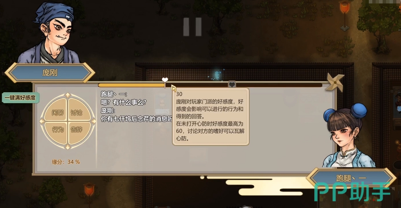 找到他之后让跑腿的过去与其闲聊,主要是刚开始的时候只能闲聊,其他的功能需要好感度高了之后才能解锁,所以一直与其闲聊直到好感增加到30的时候,就可以解锁旁边的“讨论”选项。