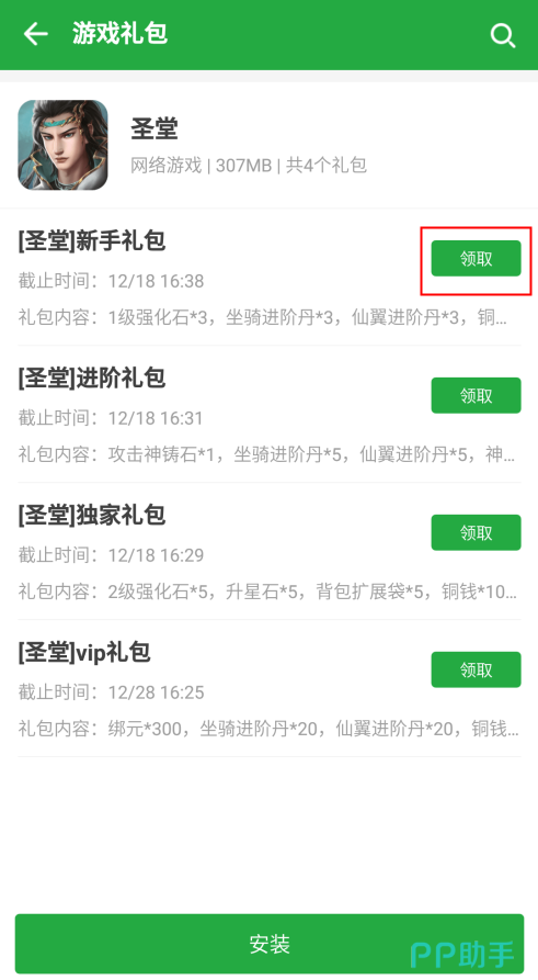 在豌豆荚内下载并安装完圣堂的玩家,点击进入游戏详情页,在游戏详情页内找到周边里面的游戏礼包。点开游戏礼包可以看见各个礼包的具体内容和领取的截止时间。