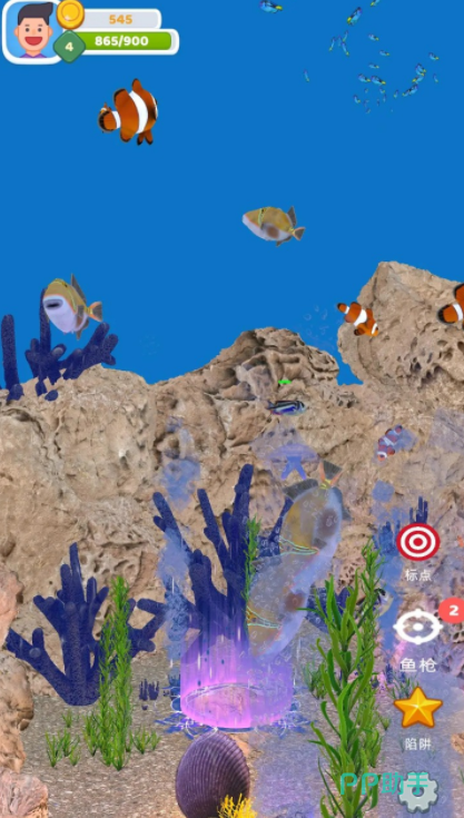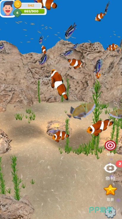 进入了我的海洋世界之后,每个玩家都可以身着潜水服,下潜到海水中,在这里会有一副漂亮的水底画面会呈现在眼前,不止有大量的鱼类,还有很多海底的植物,玩家需要做的就是通过点击的方式把这些鱼类都抓捕起来,想要抓捕这些鱼类玩家需要利用不同的工具,首先最基础的就是鱼枪,可以用鱼枪来抓捕一些体型比较小的鱼类,每次抓捕鱼类玩家都需要猛烈点击屏幕,也只有这样鱼枪才能准确命中小鱼,抓不到的鱼类都可以收纳到玩家的仓库中,可以通过售卖这些小鱼获取大量的收益。