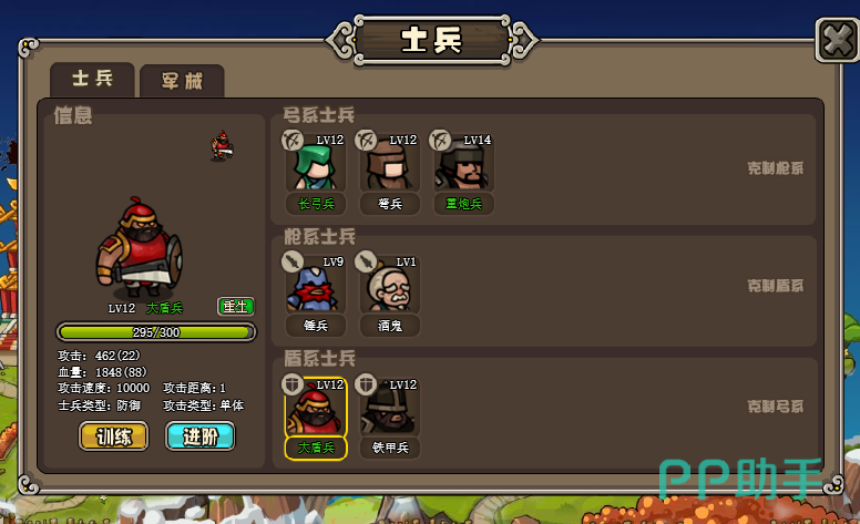 要学会观察敌人的第一波兵类型,兵种大类总共就三种,枪兵、盾兵还有弓兵,枪克盾、盾克弓、弓克枪,所以可以先慢一秒钟,看到对面第一波兵是什么兵,再选择自己出战的兵种。第一关通常对方会先派出炮兵,也有可能随机到枪兵,只有这两种可能,所以大家要从盾兵或者弓兵里选择一种。