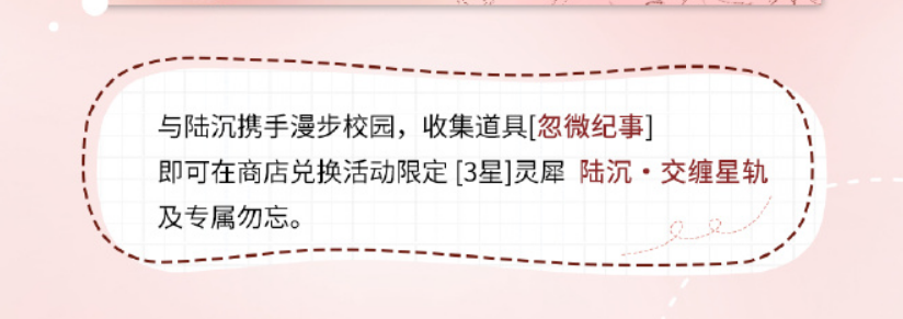 在这个令人期待的"风华追忆"活动中,玩家们不仅可以体验精彩绝伦的剧情,还将有机会获得一系列珍贵的限定奖励。首先是投身于校园生活中,与陆沉一起解锁那些被时光掩埋的秘密。通过收集特定的道具——【忽微纪事】,玩家可以在活动期间兑换到限定的3星灵犀——陆沉・交缠星轨,以及与之相伴随的独特勿忘配方。