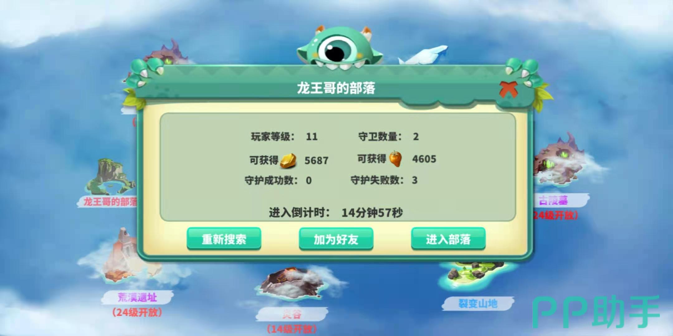 第三步,去别人家的次数是有上限的,每天20次,并且每次进入别人的家需要耗费20个源晶矿以及4个食物,后期会有所增加,搜索成功后的玩家,在15分钟内点击右下角的进入部落即可,这样就可以进入别人家了。