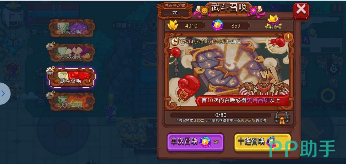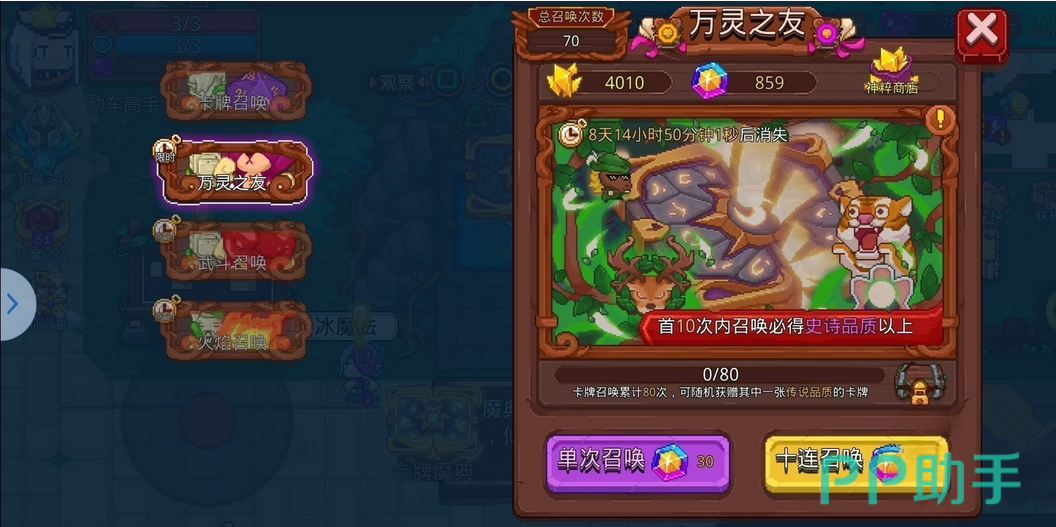 接着就是限定的卡池了,这里面可是有很多玩家想要得到的卡片,史诗卡的数量有很多,像万灵之友就是很多玩家都想要抽到的卡片。玩家们还可以在这里面抽到两张金色限定卡,这这类型的卡片还有召唤伙伴的功能,非常受玩家的喜爱。