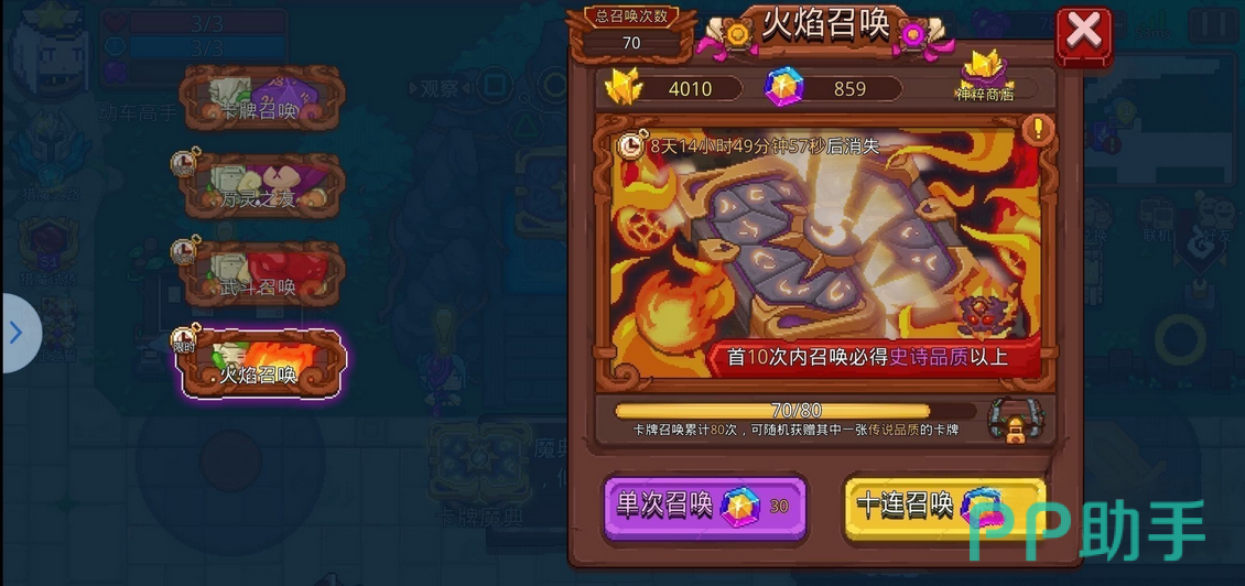这里面还有个火焰召唤的池子,里面能够抽到的卡片很多也是很强的。像金色卡牌就包含火焰融合、火战戟和烈焰法典,这几张牌都能够输出非常高的伤害,可以让玩家进行各种搭配。