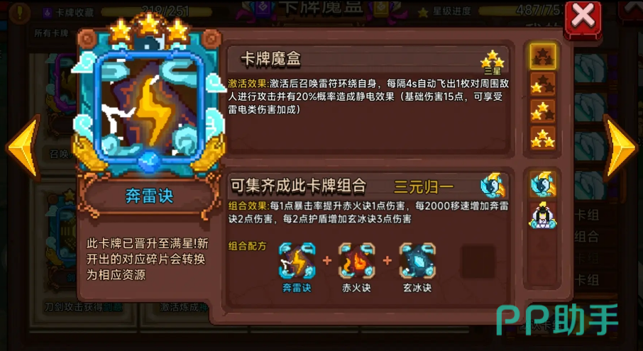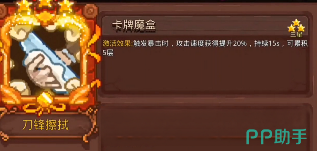在这里先给大家介绍第一张卡,它的名字叫做刀锋擦拭,它在战斗中是能够触发暴击的,然后将攻速快速提升20%。效果持续的时间还是挺久的,总共有15秒。这个效果还能够叠加最高5层的层数,不过卡要达到满级才行,满级是3星。如果是在卡组里面的话,发挥出来的效果就会更加厉害。需要有一张叫作千锤百炼的卡能够组成羁绊效果,对于叠加来说,伤害将会没有上限。