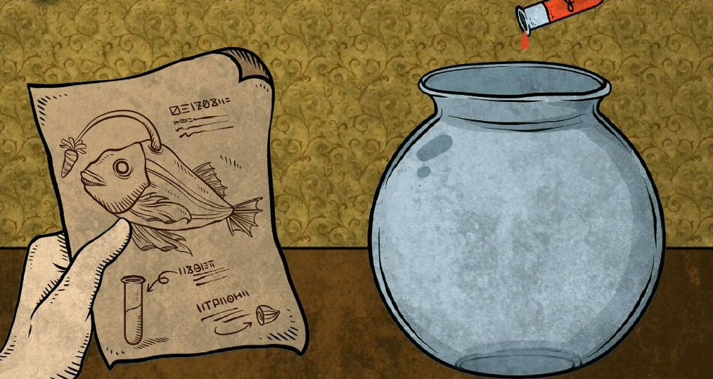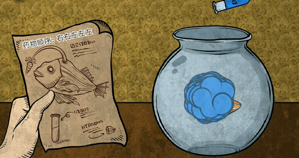 在这一关里面大家可以看到主要的画面中显示的就是养鱼的鱼缸,左边还有一只手,手上有一张图纸,其实进入游戏之后大家是需要先看图纸的,图纸上面记载了养鱼的技巧,也就是需要药水,这个药水也是需要大家调配的。