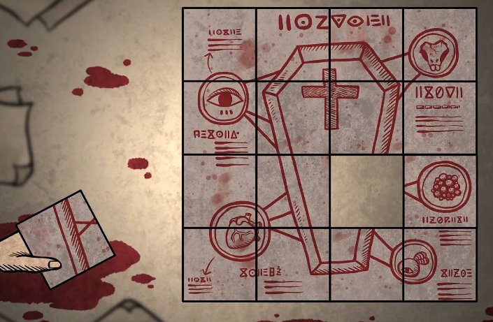 首先出现在复活部分剧情的第一个画面是一个图纸,这个图纸上面有很多的小图案,这些图案就预示这复活的小秘密,而玩家则需要按照上面的图案来进行图纸分割,不同的图案放在不同的区域,大概是可以分成四个部分,每一个部分都会有一个小图案。