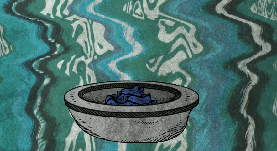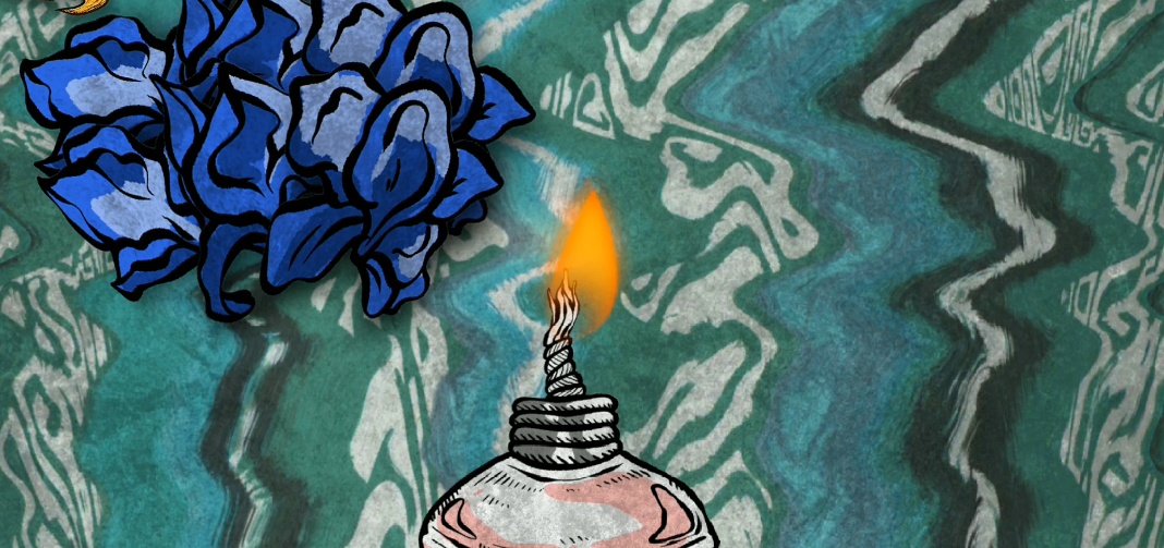 画面一转大家就会砍价一个蜡烛灯,这个蜡烛灯是已经点亮的,左边大家会看到之前采集的蓝色花,这个时候大家将花放到蜡烛的上方烧,随后将蓝色的花烤制成为黑色的,有烟雾冒出来的时候就代表以及烧好了,将烧好的花利用旁边的罐子进行研磨就可以了。