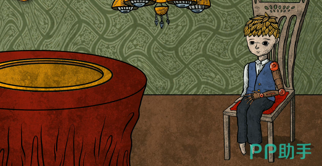 而这张图上面大家就可以看到弟弟的缺陷就是在手臂上,椅子上面坐着的弟弟身上没有手臂,而在画面左边有一个红色的圆桌,在圆桌上面有一个金黄的圆盘,圆盘里面里面装的就是一个义肢,拖动义肢给弟弟安装好之后大家还需要观察。