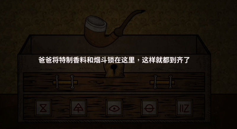 - 输入正确顺序后,木盒子会打开,里面藏着父亲的烟斗和香料,这些都是前往下一关的必要道具。