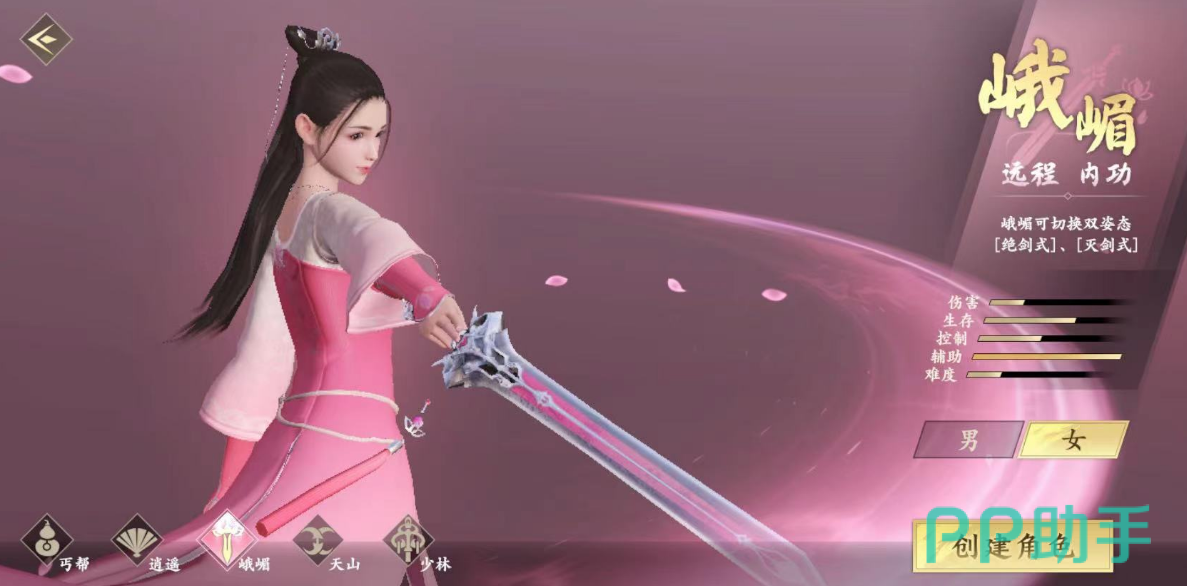 接下来说下峨眉,这是个辅助职业,特点就是治疗队友。她们的攻击手段也以远程攻击为主。值得一说的是,她们的保命能力很强,在面对必死攻击时可以豁免这次攻击,避免自己受到伤害。另外,有很多玩家都喜欢玩这个职业,原因就是可以为队友恢复血量。