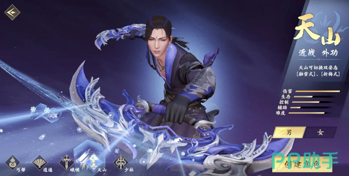 第二个给玩家带来的就是天山派,天山派在游戏当中是一个输出职业,同时他也是一个刺客型的角色,他可以隐身靠近敌人,对敌人使出致命一击,同时一瞬间的爆发伤害也是非常高的,他的机动性也很强,也是十分灵活的。