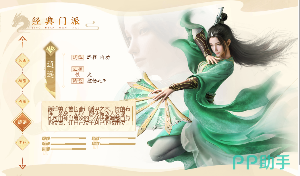 之后来说下逍遥这个门派。这个门派的控制能力很强,擅长在战斗中用各种阵法来攻击敌人,可以对敌人造成火属性伤害。由于攻击手段特别,他的上手难度还是很高的,很难玩好。