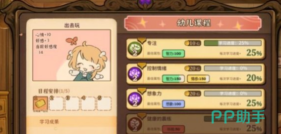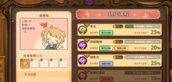学习自理的任务就是要和女儿一起去完成三门课程。这里需要注意的是,每一门课程必须要把学习进度直接提升到100%,要是能让课程达到最佳的属性,就可以额外的增加25%的进度就可以更快的加快任务推进度。例如选择了礼仪课,就需要专注跟着课程的节奏走,认真的完成每一次学习的互动。等到进度条满了之后,这一门课也就等同于搞定一门,另外还有一个小建议,每完成一门课程之后,不要着急开始下一门,而是带着女儿去玩一会儿秋千。可以放松心情,还能提升亲子好感度。
