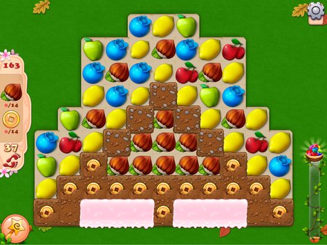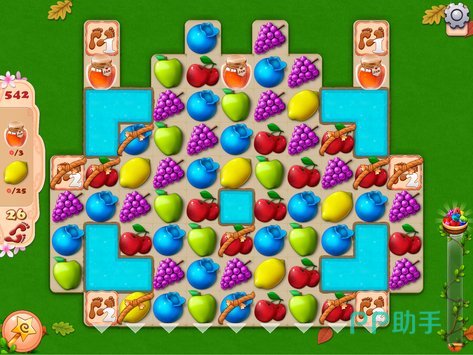 进入游戏后,玩家将开始在装点自己的庄园,由青石板铺成的庭院,中央有精致的秋千,四周环绕着碧绿的花坛,庭院的一角还有一潭清澈的人工湖,玩家可以与你所看到的场景、物品以及人物进行交互,奶奶、邻居等等,每个人物有不同的技能,每个场景有不同的交互动画同时将会开启玩家挑战关卡。游戏的主要类型是消除,玩家需要点击水果图标和旁边的水果交换位置,连续三个相同的水果就能消除,当然如果能够构成连续多个水果或者连续的特定图案,则玩家可以获得更高的分数,游戏结算后也能获得更丰厚的奖励。