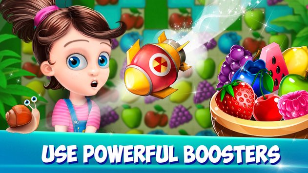 游戏过程中玩家可以使用道具,比如火箭、炸弹之类的,这些道具可以起到消除特定形状方格内水果的作用,当玩家发现没有可移动或者可消除的水果时,则可以使用相应的道具打开局面,对于不同的关卡,玩家在进入消除模式前,与你交互的场景或人物会赋予玩家特定的技能,所以玩家也可以利用这些技能在消除过程中起到意想不到的作用。