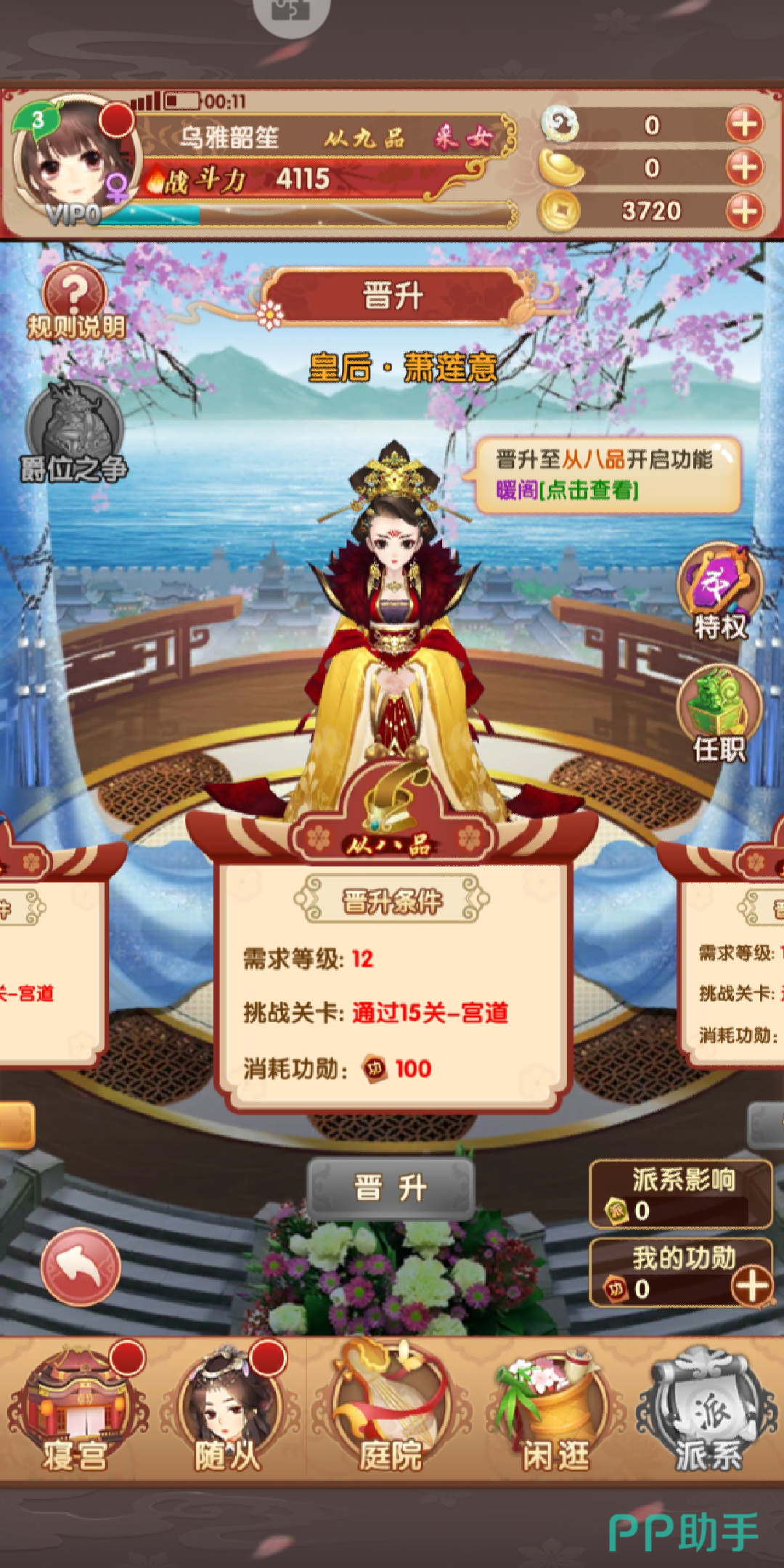其次,暖阁的开启需要达到从八品的品阶,那么问题来了,玩家的品阶应该怎么提升呢?这时玩家应该点击寝宫这一小标,来到首页,再点击你选择的人物,旁边会弹出一栏有四个小标的内容,点击晋升这一小标,玩家会看见上图,从八品的晋升条件需要等级达到12级,并且通过挑战关卡的第15关宫道,还需要消耗100的功勋,才能获得开启的条件。