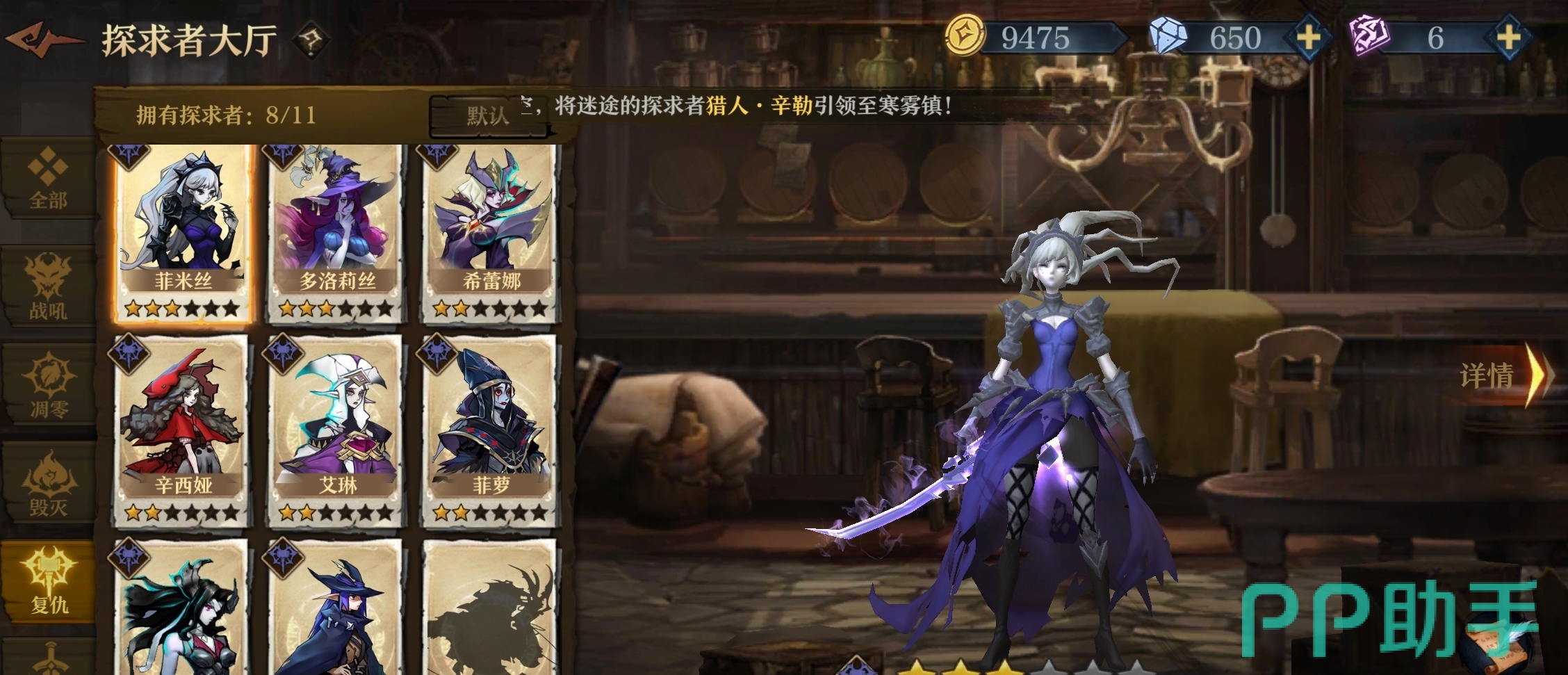 夜莺与希蕾娜是辅助,其中希蕾娜是奶妈,小编选择夜莺的原因是由于她的群体技能有给敌人附加【睡眠】debuff的效果,能够让敌方停止行动,而选择希蕾娜单纯是因为她奶量够大,虽然她的技能所回复的奶量一般,但是她的被动有【回溯】这一效果能够在每回合进行额外的血量恢复。