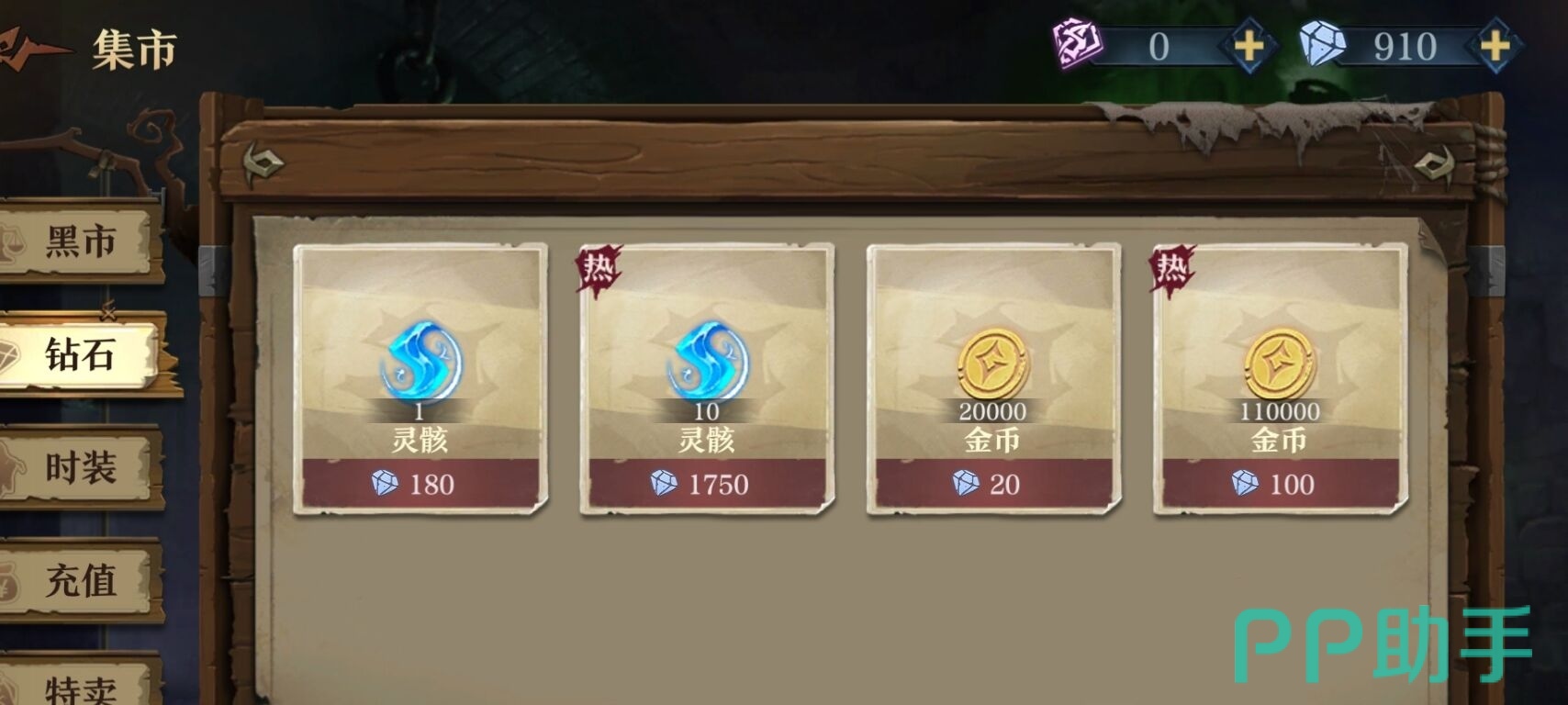 钻石在游戏中其实是一种流通用的货币,它的具体用处其实就是到游戏界面的右下角的【集市】中的“钻石”一栏进行购买物品,钻石可以购买到的物品有灵骸与金币,灵骸是一个发光的蓝色晶石,是在【幻妄之厅】进行缔结时所使用的材料,金币则是游戏中除了钻石之外,另一种流通的金币,玩家只要花费20颗钻石就能够购买到20000个金币。