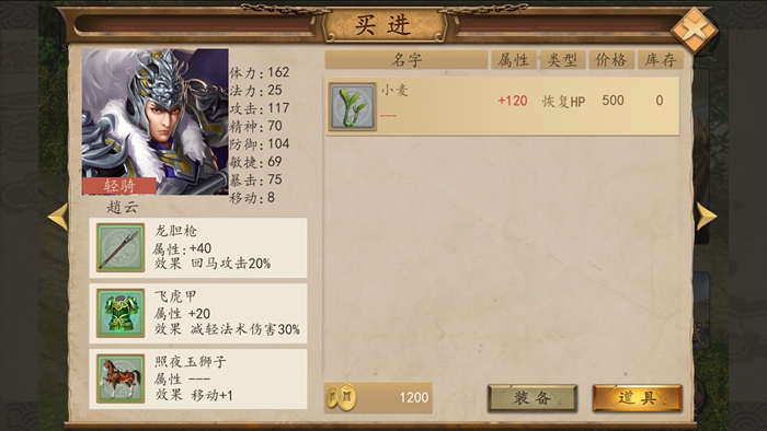 三国戏赵云传中金币是基本的货币,能用来购买普通装备和道具。能购买的普通装备分别是短枪短剑等一系列的普通武器,能购买的道具基本上只有回血的小麦和大米,小麦是回120血,大米是回200血。小编的金币一般就是用来购买回血道具。