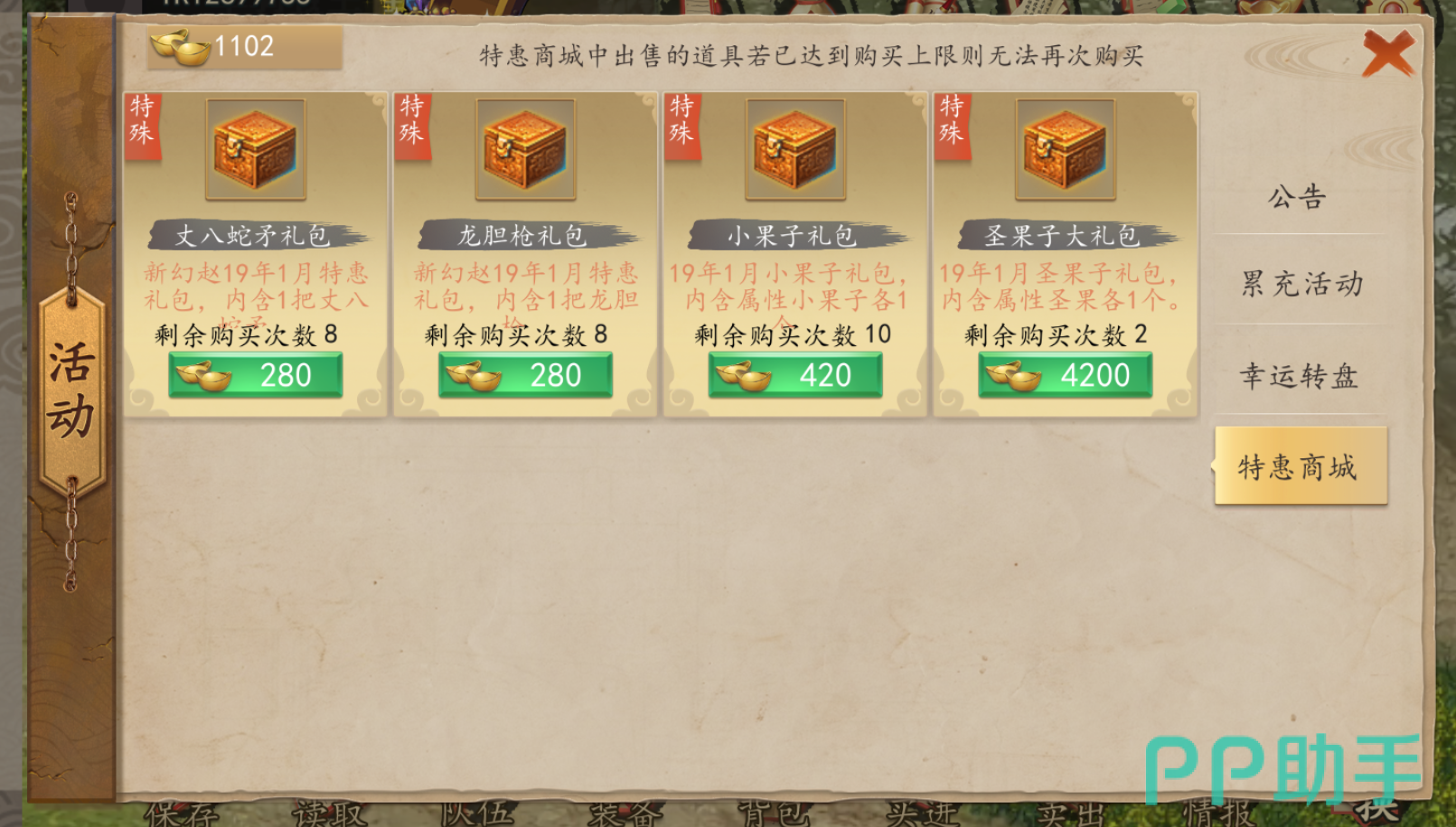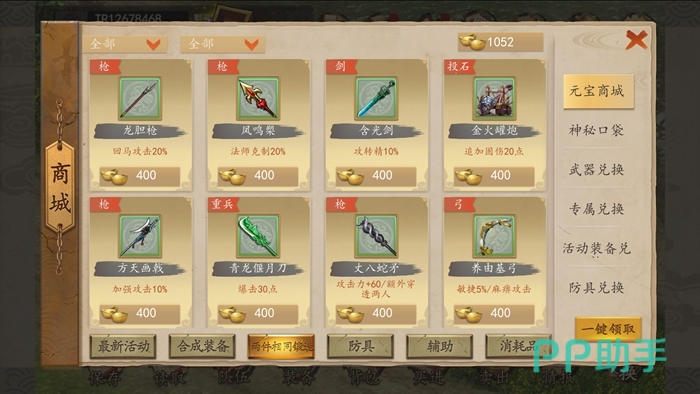 不过金币购买的道具还是很有局限的,在这里小编建议大家还是购买元宝的专属装备。游戏中武将的专属装备,在游戏中完成任务会送,一些没完成任务的可以在商场购买套装之一补齐,而新手第一次玩游戏会送一千多元宝,够大家日常所需了。