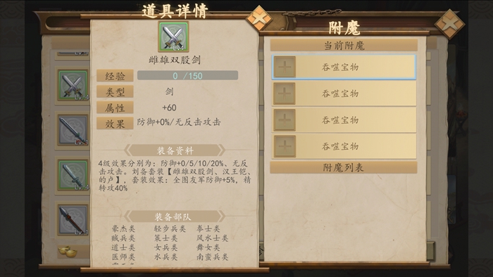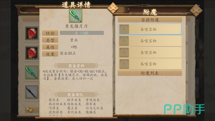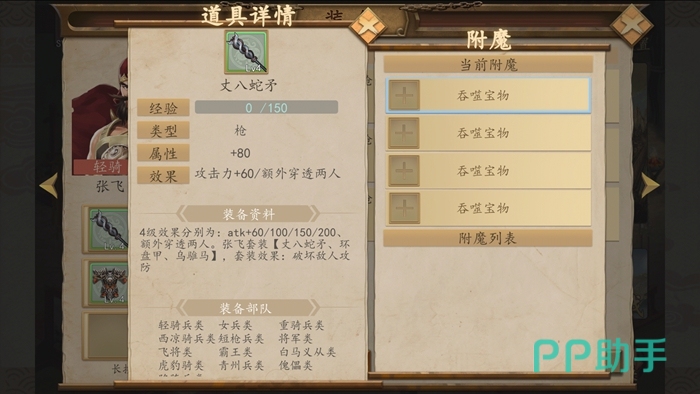 如果嫌这样的操作太繁琐,选择自己的喜欢的武将,在右侧装备栏找到自己想要装备的武器防具,直接轻点就可以自动换上自己喜欢的武器装备。