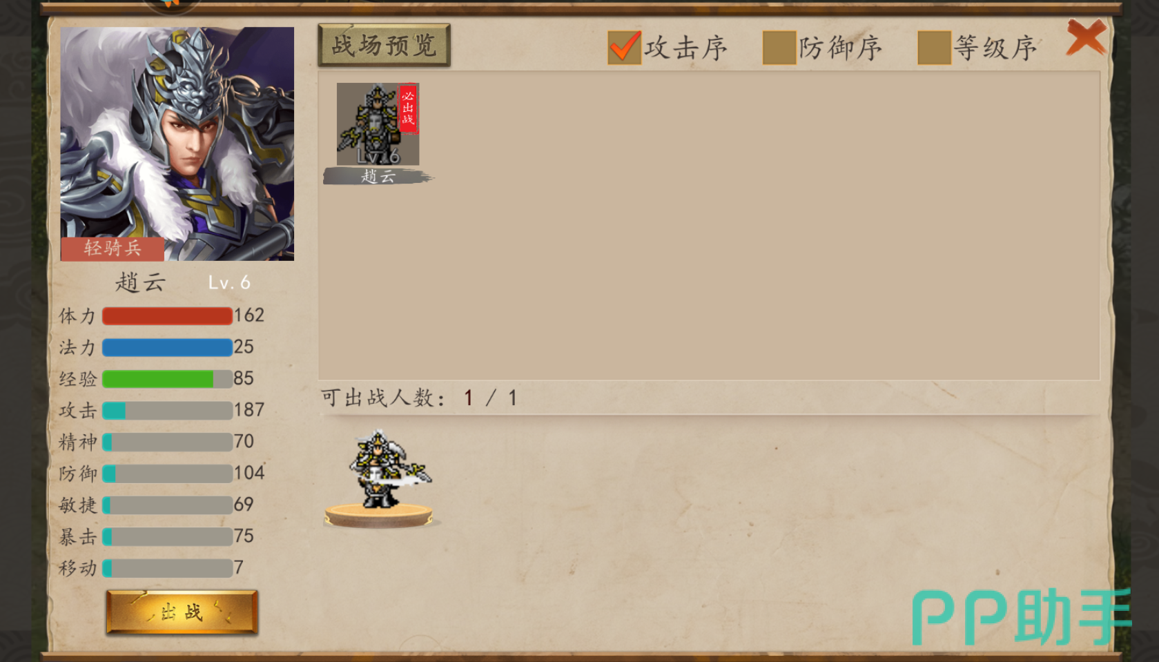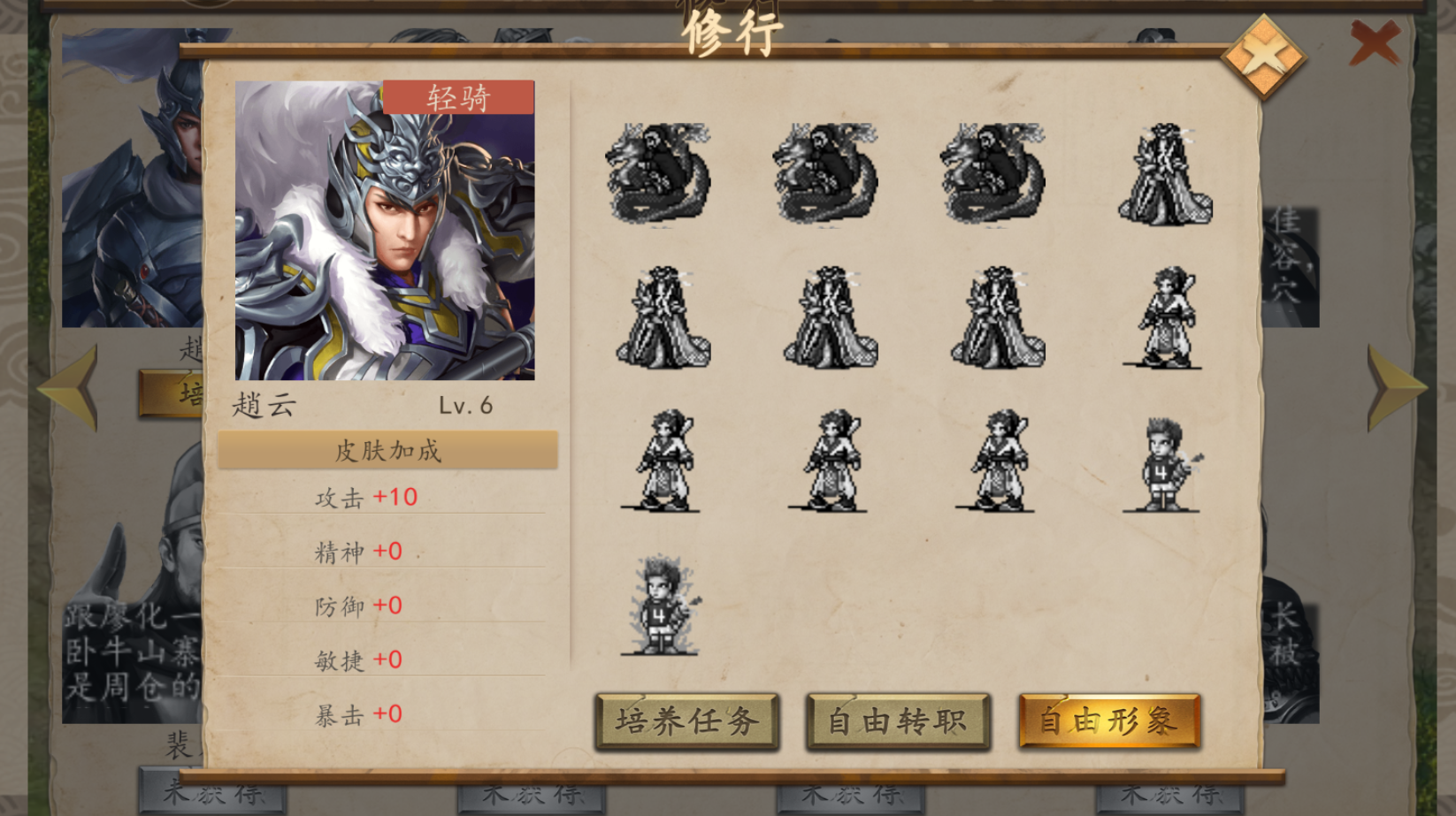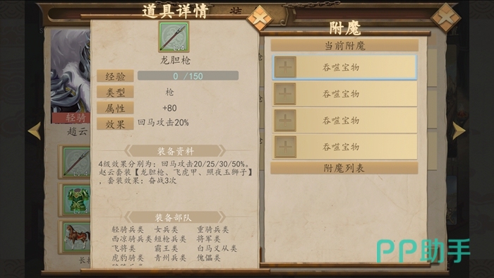 首先第一个武将自然是我们的主角赵云了,在所有关卡中赵云都是默认出场的,就是说赵云每局都会上场,所以我们必培养赵云。而赵云有其专属套装,如龙胆枪,飞虎甲,照夜玉狮子等等,穿上后非常强力,随后就是赵云的等级了,主要练赵云的等级,在游戏中七进七出不是问题。