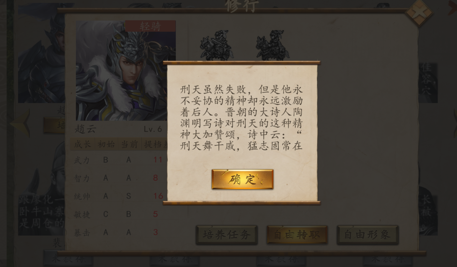 两种转职中,白马义比较偏向基础属性点的增强,这样会使我们的普通攻击增强,不喜欢使用技能的小伙伴可以选择这个方向。而刑天转职则是使赵云彻底魔化,在基础属性点小幅增加的情况下,大幅改编了他的技能强度和攻击范围,使得他的群体攻击变强了。