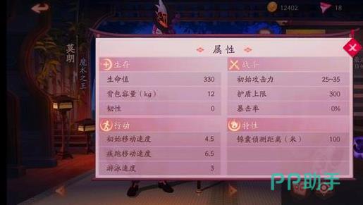 性命330 挎包12 韧性0 攻击25-35 防御盾限制300 爆击率0 初始移动速度4.5 疾步移动动速度6.5 游泳能力3 特征:锦囊侦测使用的范围为100米