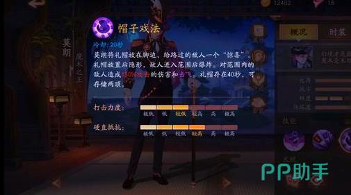 三技能帽子戏法,莫朗将礼帽放到脚边,给路过的对手1个“意外惊喜”。礼帽使用后隐身,对手进到范围后爆炸。对范围内的对手带来150%攻击的伤害和击飞。礼帽存在的时间为40秒,可储存2顶。CD20秒。