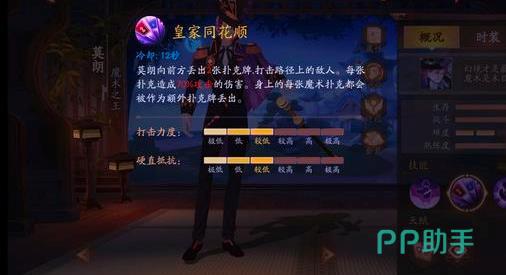 二技能皇家同花顺,莫朗向前面扔出二张扑克牌,进攻途径上的对手。每张扑克带来70%攻击的伤害。手上每张把戏扑克都可能被作为另外扑克扔出,CD12秒。