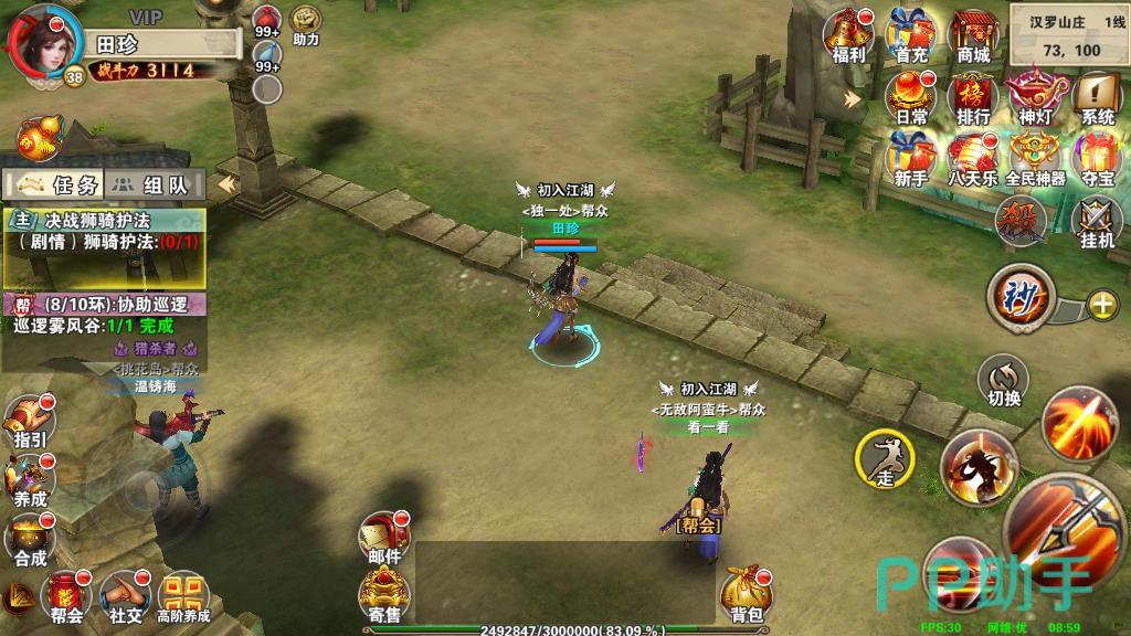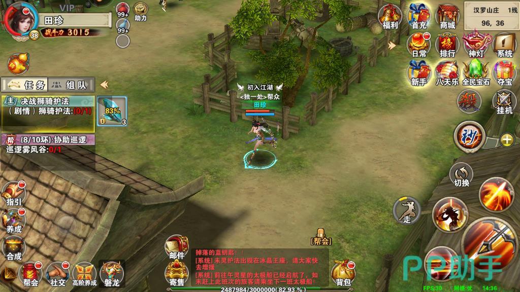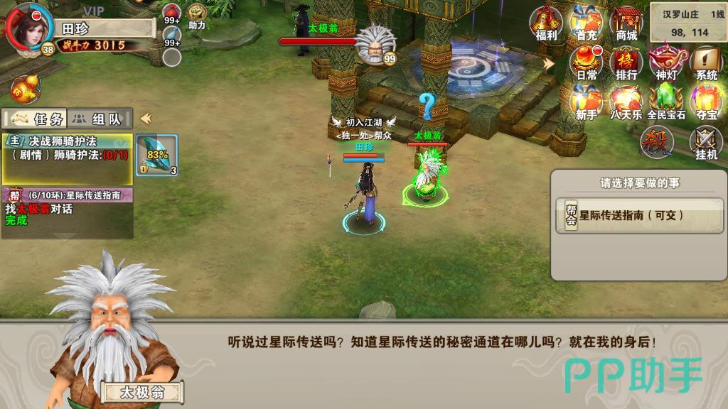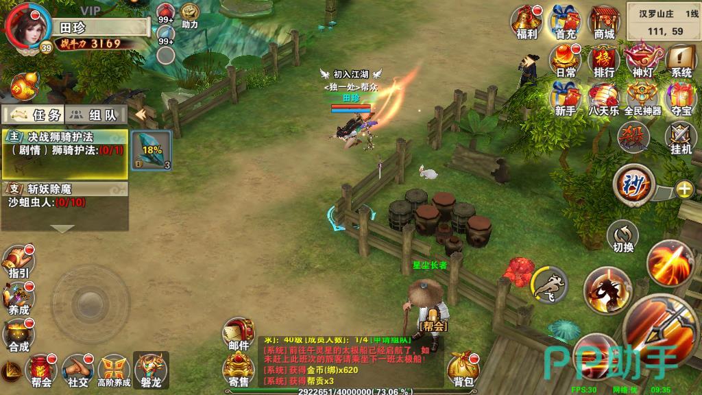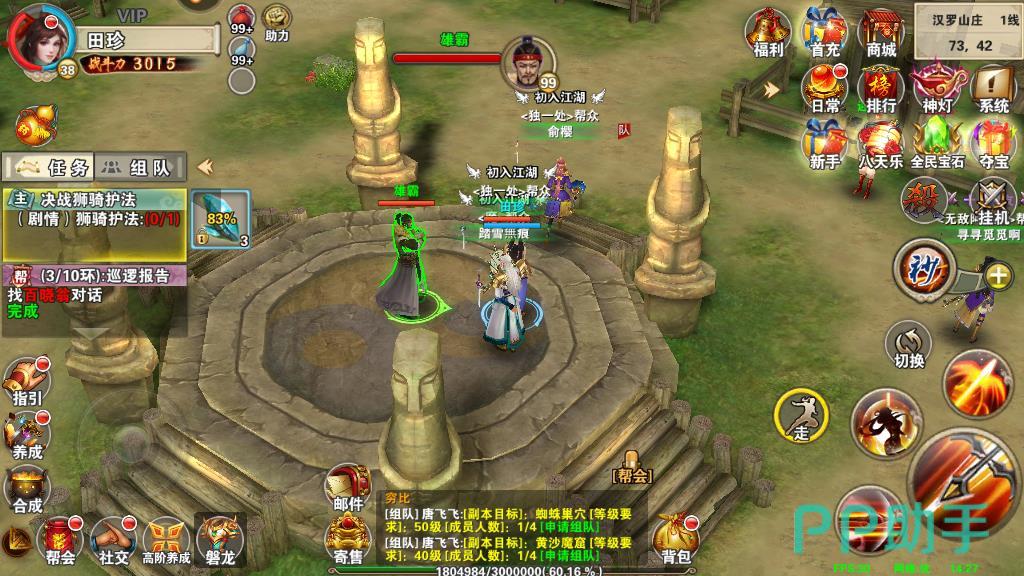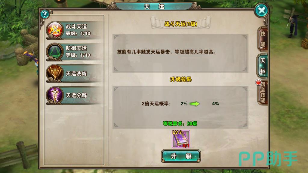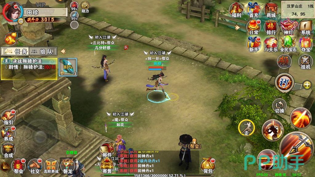 3、然后通过完成副本进行升级。可以通过日常的经验副本来提升,在汉罗山庄找到副本使者点击参与即可。玩家每日能够参加两次的经验副本,通关之后不仅可以获得高倍的经验奖励,同时还有几率获得天运秘籍材料的掉落,是每日必做的一个挑战。