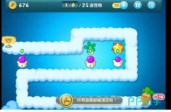 在9波怪兽消灭之后,玩家就可以建立基本的防御的塔防了,这个时候玩家的就可以把周边的道具都清楚干净。玩家可以开两倍的速度清除怪兽,而且在这个时候金币的数量也会增加,玩家可以在之前的地方布置一些新的塔防,攻击力增加,玩家越容易过关!