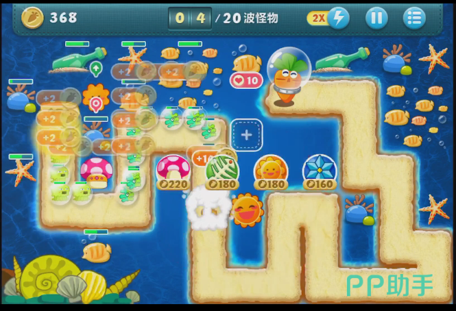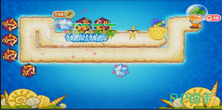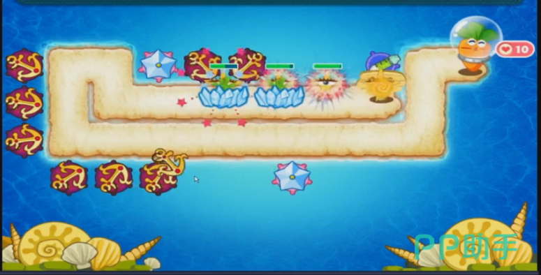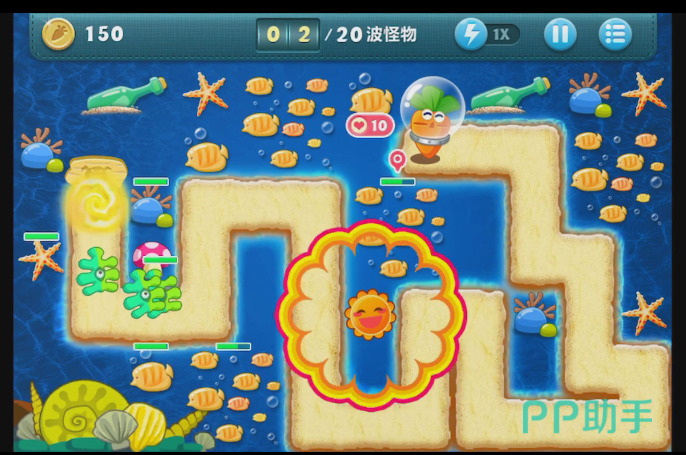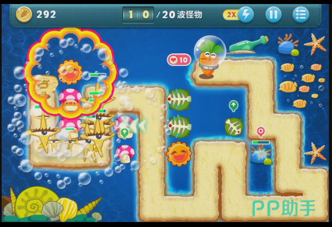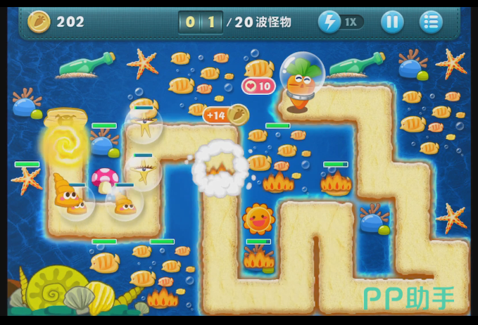 游戏越大后面的时候,怪兽的数量就会增加的越多,而且怪兽前进的速度也会增加。所以这个时候玩家就必须要布置一些可以怪兽前进速度的塔防了。在这个模式里面能够减速的塔防就只剩下冰冻海星了。当怪兽经过的时候,他可以它怪兽暂时的冻住,阻止他们的前进。
