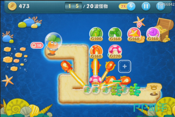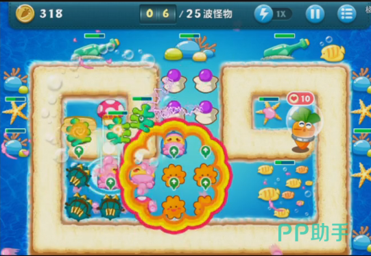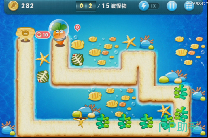 小编在最下面的空地上也是选择建立一个海星塔防,这个塔防能够在中期怪兽血量增加的时候,提供更强大的伤害。玩家这个时候可以在屏幕里面看出来,还是有很多的道具存在,能够布置塔防的地方还非常有限。