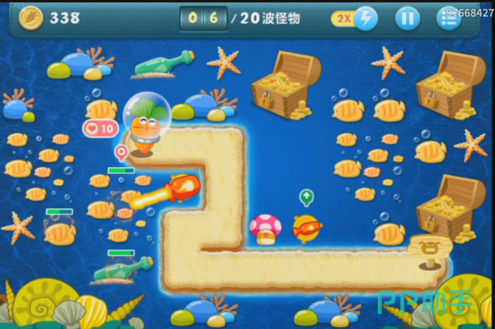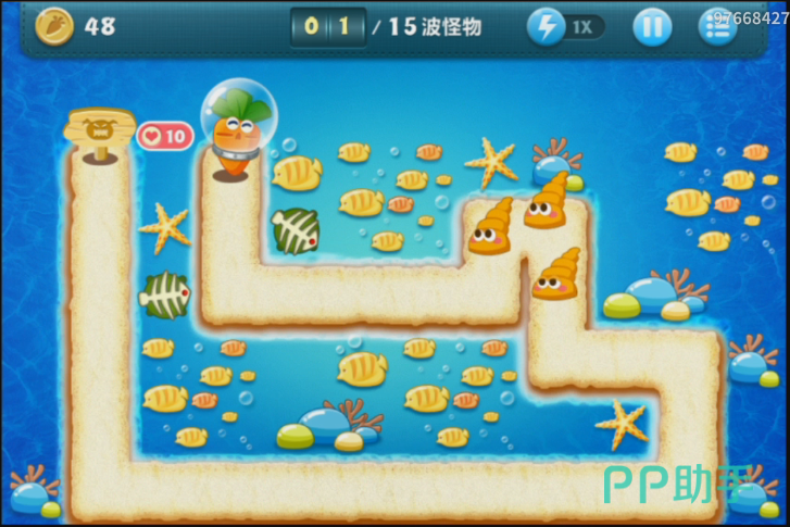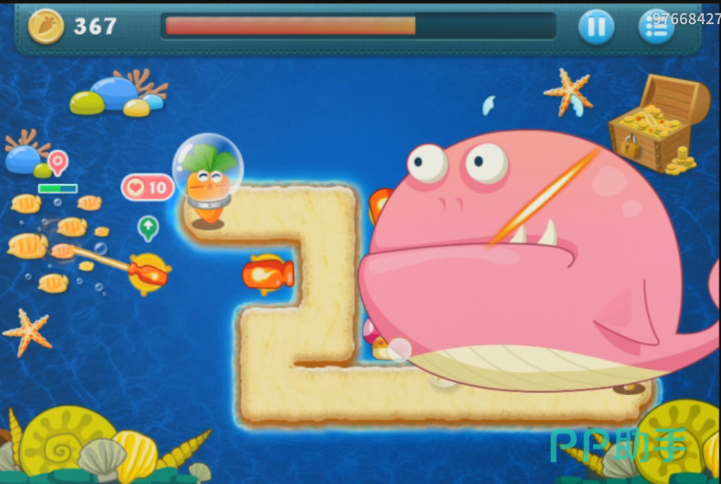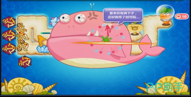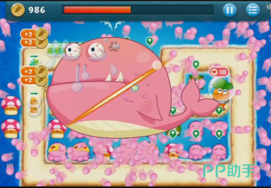 在十三波怪兽的时候,道具就清理的差不多了,玩家也会得到很多的金币,小编也在道路最左边的地方布置了一个海星塔防。在玩家布置的差不多的时候,就会出现海底里的大怪兽,鲸鱼。这个鲸鱼是粉色的,非常可爱。玩家只需要用手滑动屏幕就可以对他造成伤害,伤害越高,玩家就会获得越多的金币,但是在十几秒钟之后,鲸鱼就会消失。