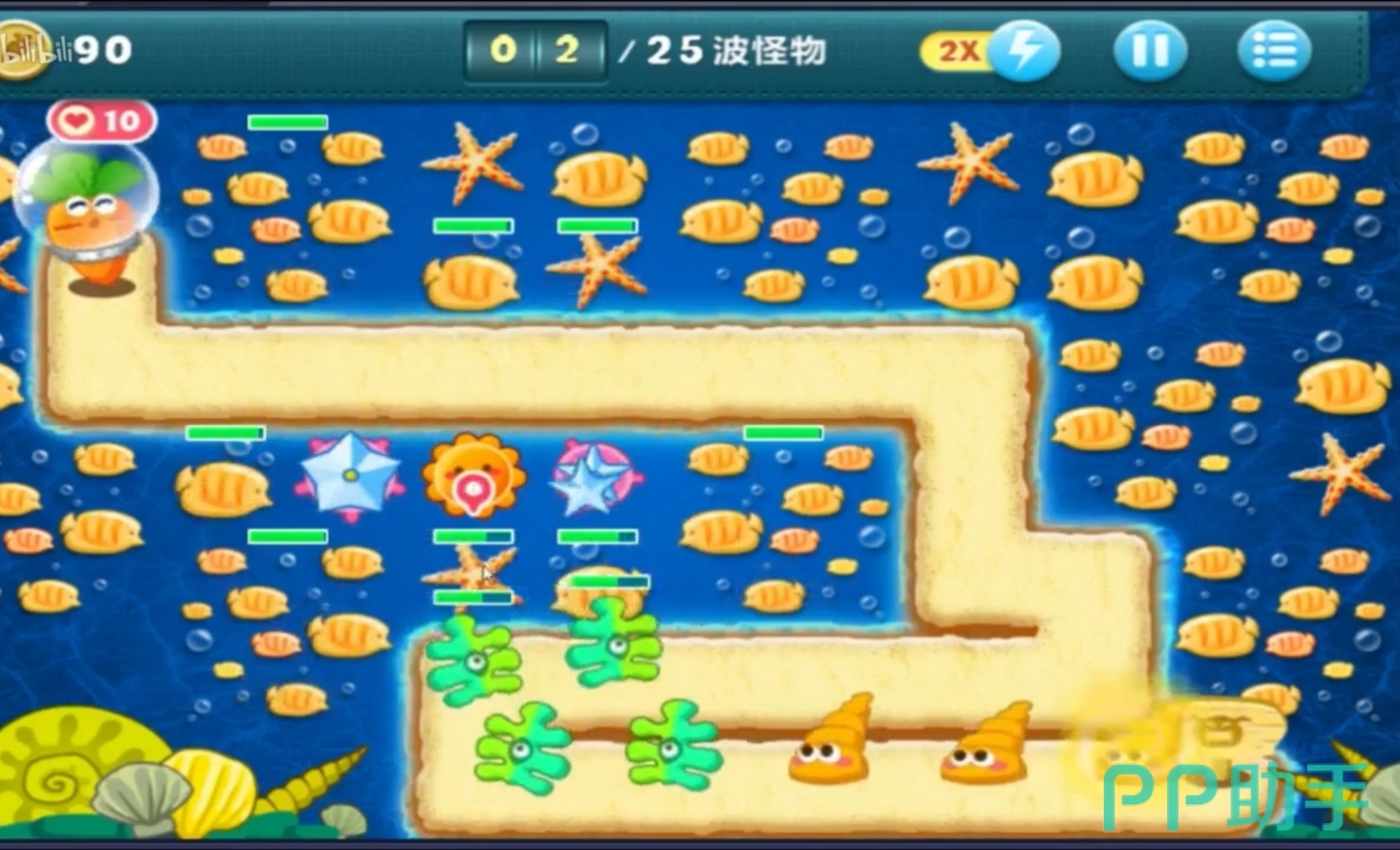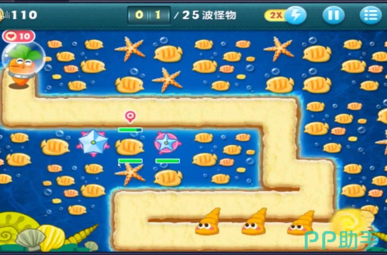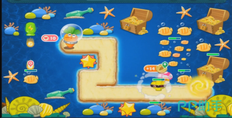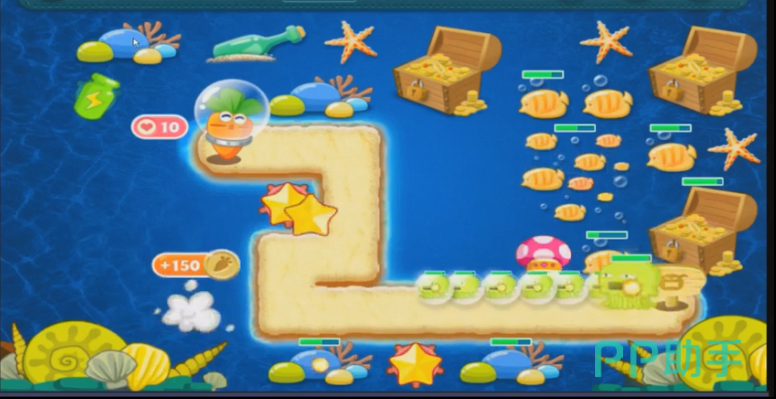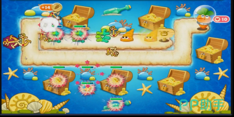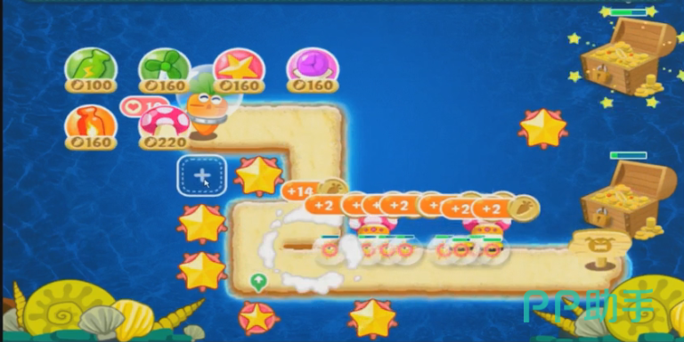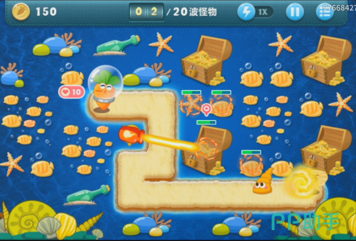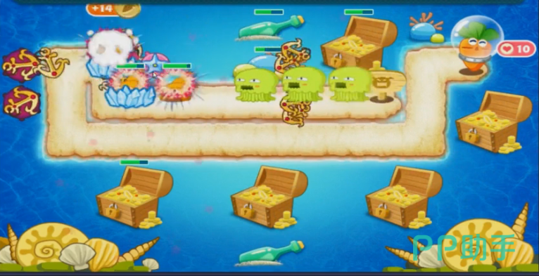 第一波怪兽就是长着大眼睛的海螺,它的前进的速度并不快,所以在他还没有到攻击范围的时候,可以让海星攻击中间的大宝箱。