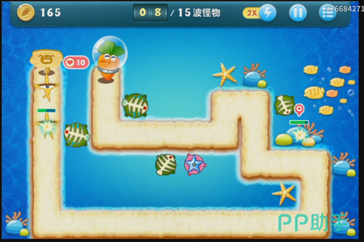 当瘦瘦的海星出现的时候,在出口的时候会受到第一个塔防的攻击,然后就是下面的鱼骨的攻击,最后在接近萝卜的时候被最后的一道防线消灭。