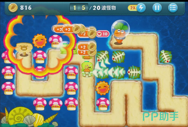 经过缩小菇的怪兽,移动的速度和血量都会有一定数量上的减少,所以在后面遇到跑的飞快的细海星和海藻的时候,玩家也是不用担心萝卜的安全的。缩小菇在一定范围内,都会有一定的伤害,在最下面的道路上也会有一个石头被他攻击到,在一波怪兽过后,就出现了一个新的空地可以布置塔防了。