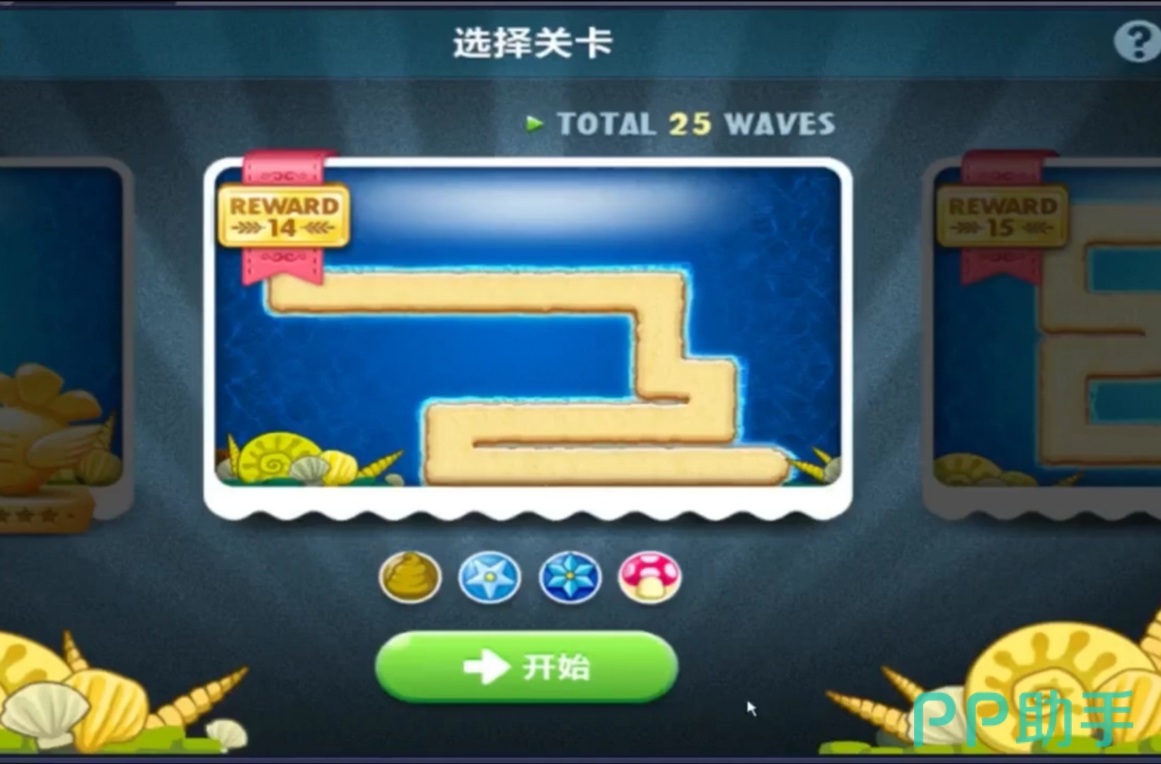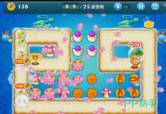 深海主题第十四关:本关怪物波数一共有25波,路程不算长,最后有几波怪的血比较厚,速度比较快,但总体来看难度属于中等.在这一关中的可选武器都是减速类的武器,没有攻击性强的道具。因此选好减速道具很重要,游戏开始玩家有1050金币可以使用,玩家需要合理的使用1050金钱搭建第一座炮塔