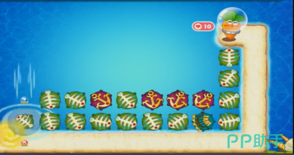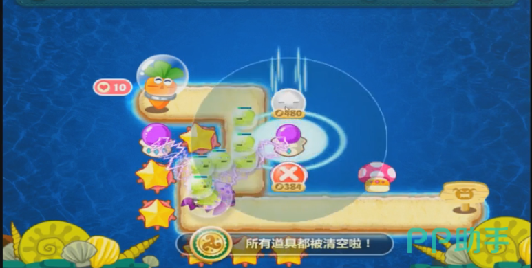 第二步 消灭第一波怪后利用减速星星清出图中位置的太阳花道具。太阳花道具可以产生范围伤害,利用太阳花的范围伤害和减速星星一边打怪一边清障碍,先清太阳花下面的海星,会得到一个攻击性较强的船锚道具,然后再清船锚右侧的大鱼,可以得到一个章鱼道具。