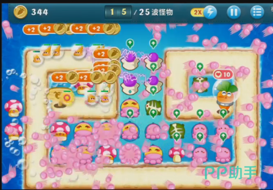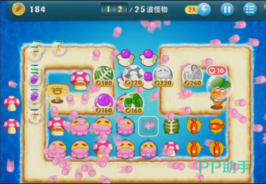 首先是粉色章鱼塔防的布置的价格不是很高,所以玩家再布置完第一个塔防之后,能够快速的布置第二个塔防。其次就是章鱼塔防随着等级的升高,能够发射的小章鱼也会越来越多,在最高级的时候,可以释放八个小章鱼,可以对周围范围及广的,伤害也会随之增加。