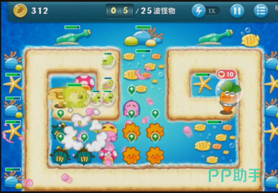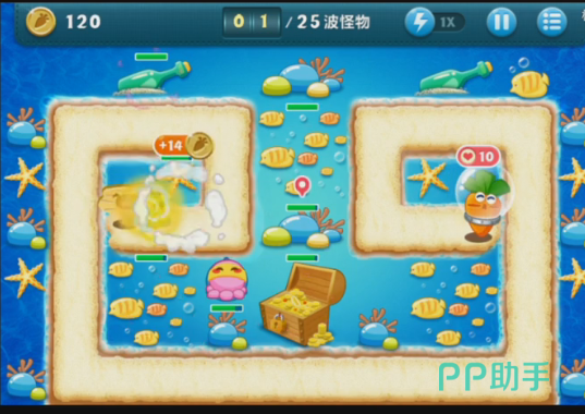 在第一个布置完章鱼塔防之后,玩家就能够在攻击怪兽的同时也可以攻击周围的道具。海底关卡里面有一个玩家和很喜欢的优点,那就是几乎所有的道具下面都会藏着一个塔防,所以玩家只要在清除道具的同时也可以获得塔防和金币。而且在后期的时候,怪兽攻击会加强,玩家完全可以布置更多的塔防来对付可爱的怪兽。