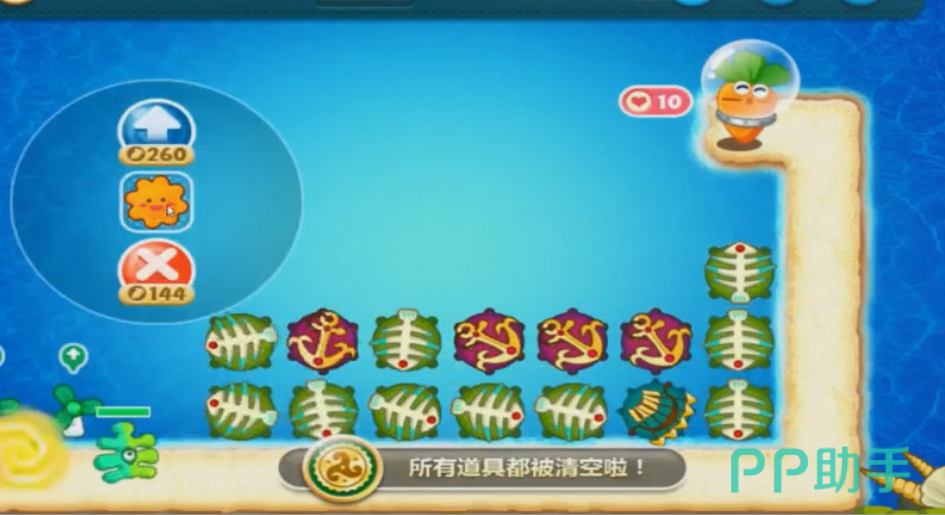 在这一关中小编是将火箭道具和鱼骨道具两个道具搭配使用,这样这一关小编的道具的攻击力会变的很强,玩家们快根据小编的攻略去试试叭~