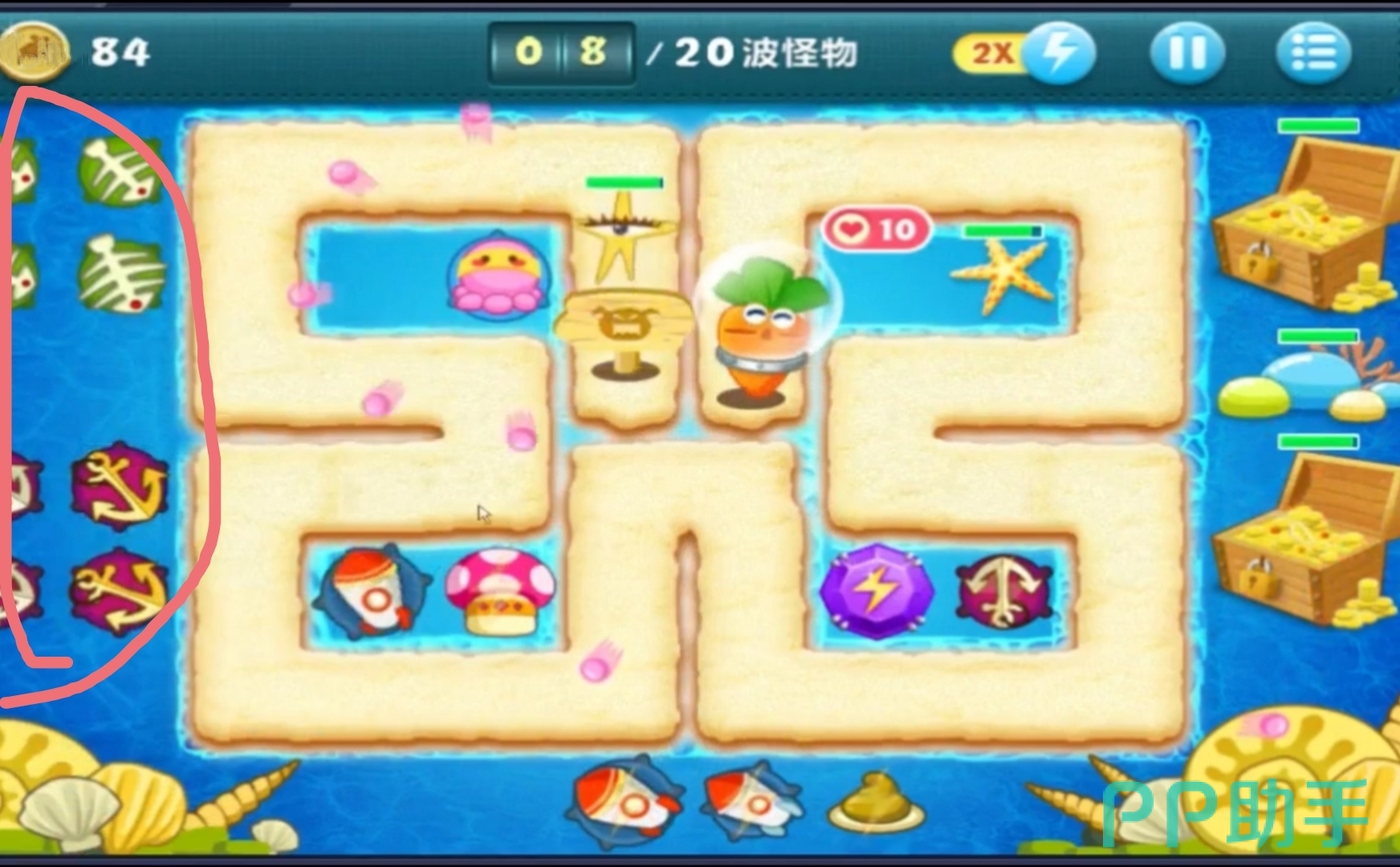 第三步 清理图中如位置的船锚道具和章鱼道具.章鱼道具和太阳花道具一样都是范围伤害道具,利用范围伤害清出周围的攻击性道具,在清第三波怪时太阳花道具和章鱼道具会清理出攻击性较强的船锚,多重箭,注射器攻击路多的怪物,一获得金币就升级炮塔,利用清出的道具先清章鱼和减速星星右侧的小鱼群,小鱼群被清后不会出现新的道具,