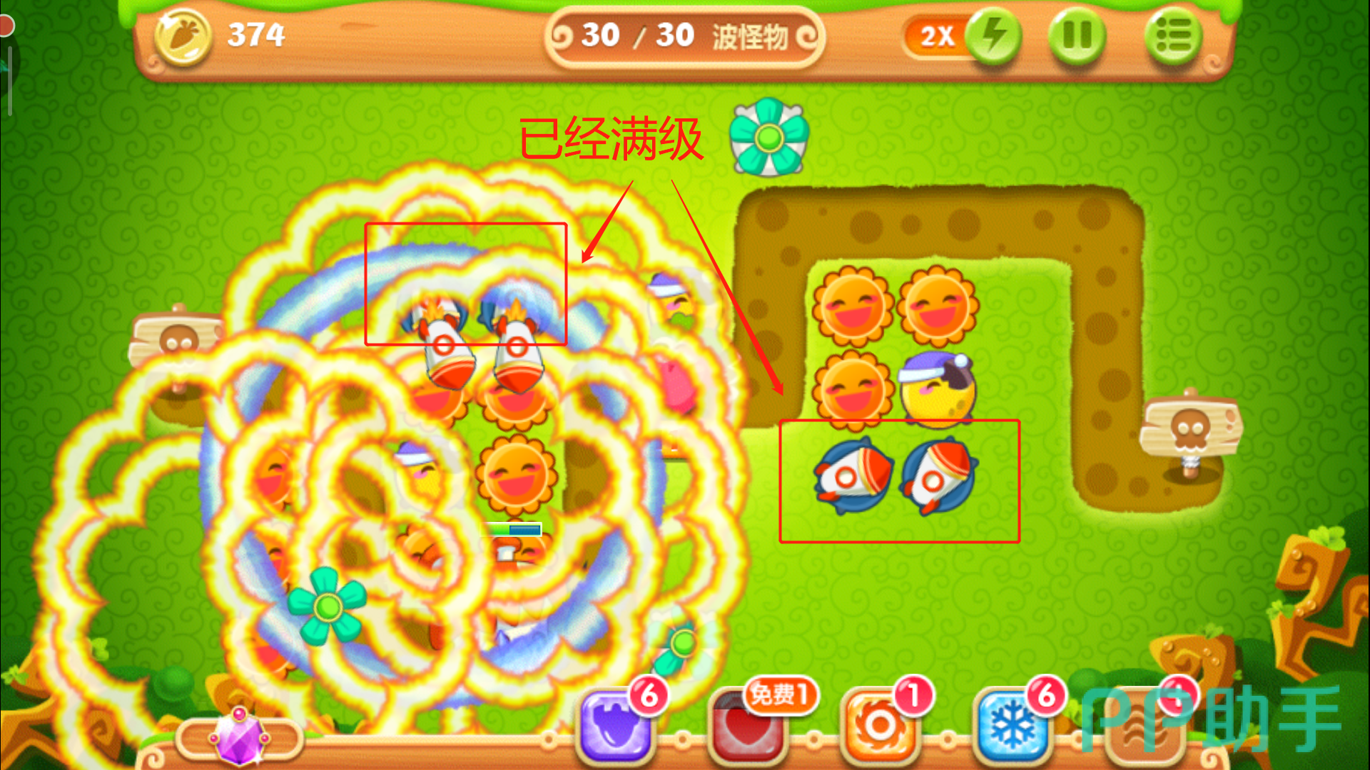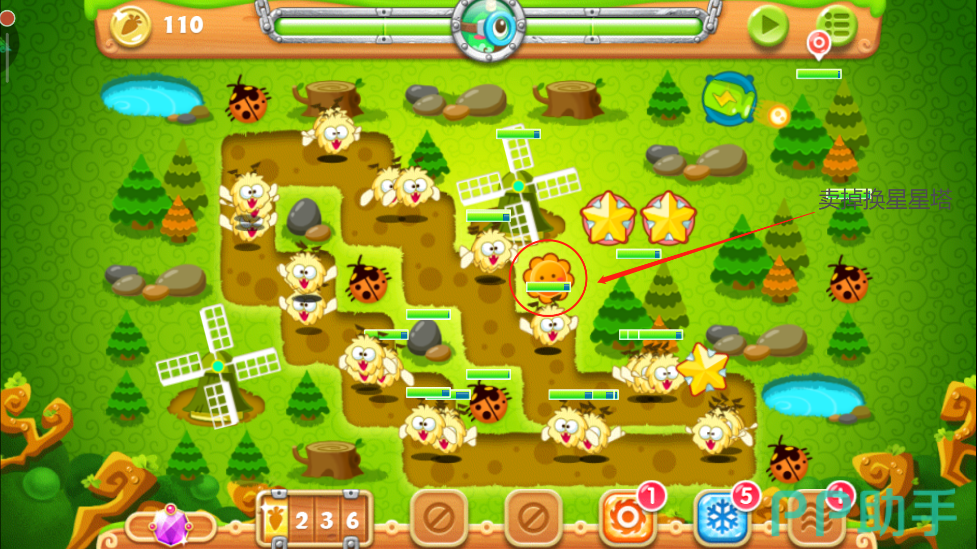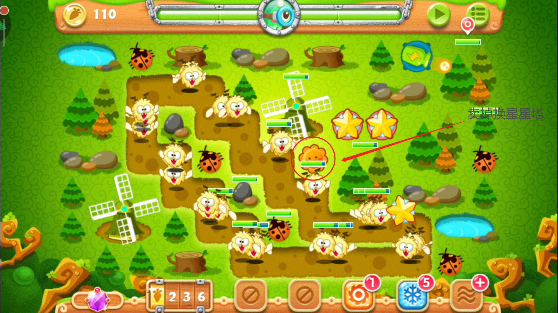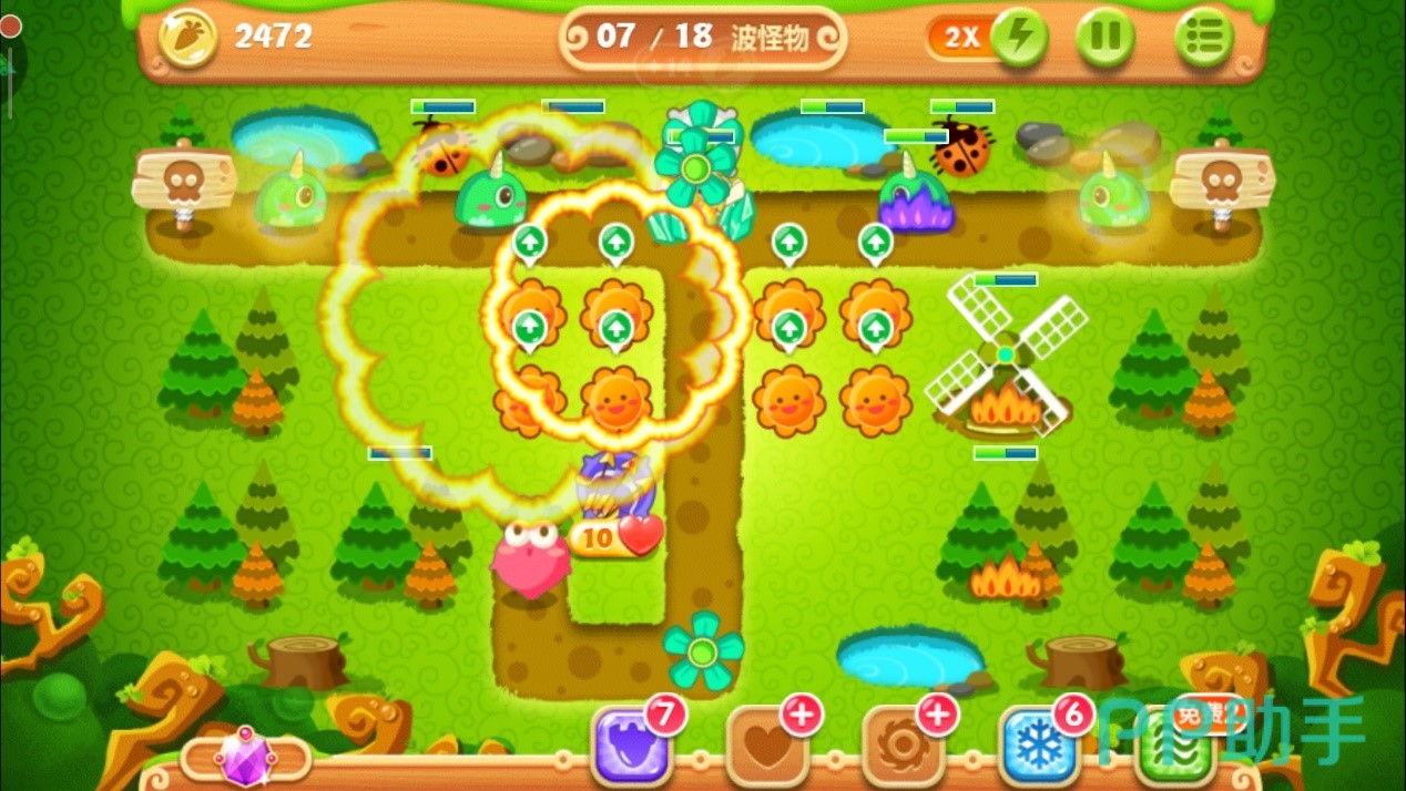 当左侧的风车以及右侧的大松树清掉后,会分别爆出四个魔法球。这里我们不用多想全部卖掉,换成太阳花与月亮的组合,四个空地放好三个太阳花和一个月亮的搭配,有控有输出,月亮就是用来牵制怪物们的全场最佳炮塔,所以要优先升到满级,用剩下的金币把周边太阳花升级即可。