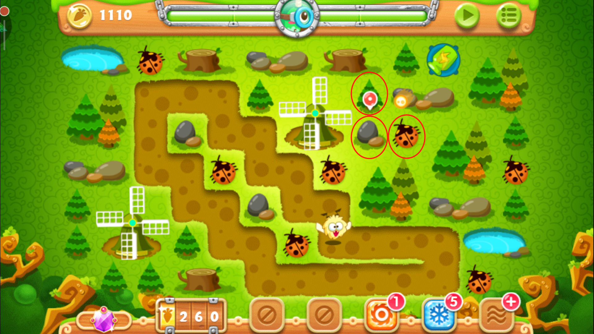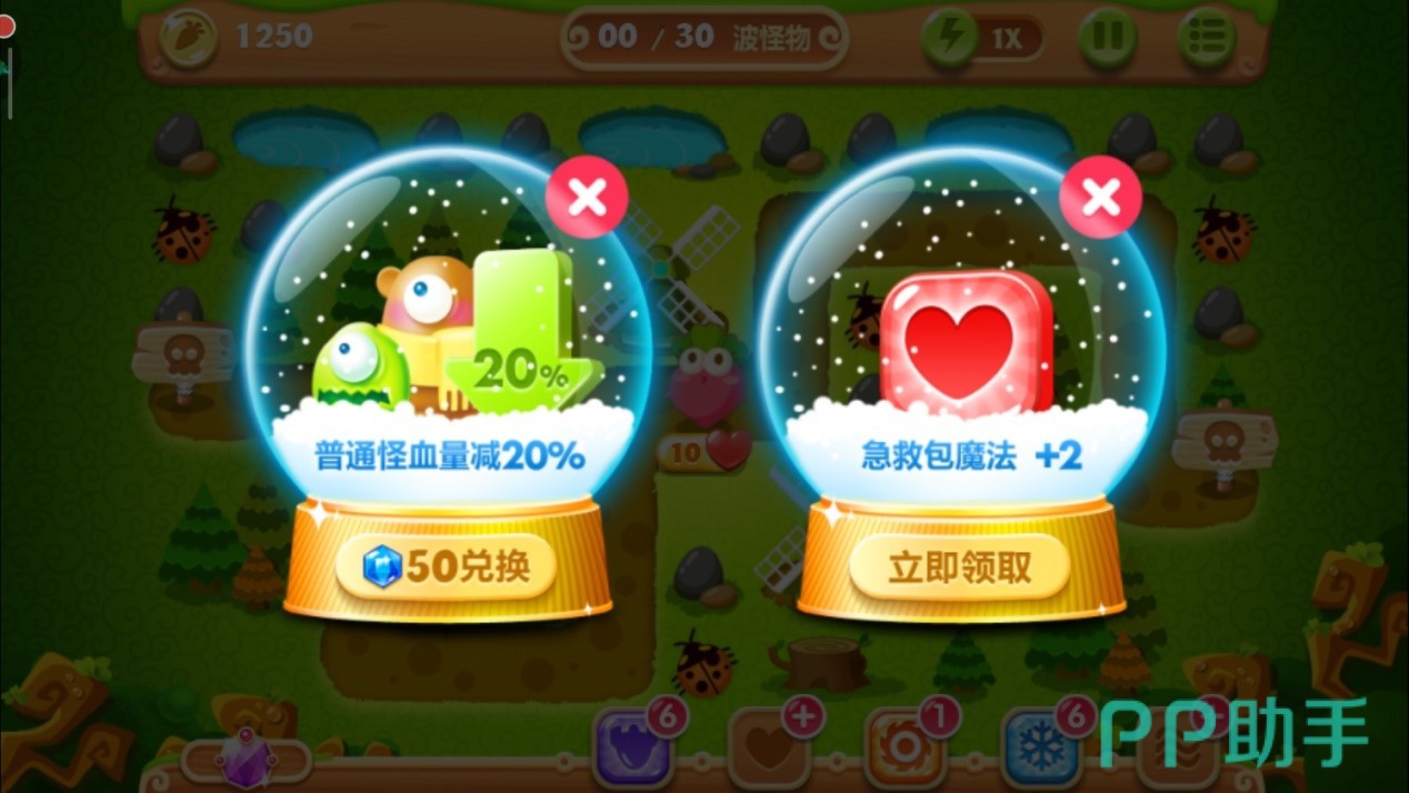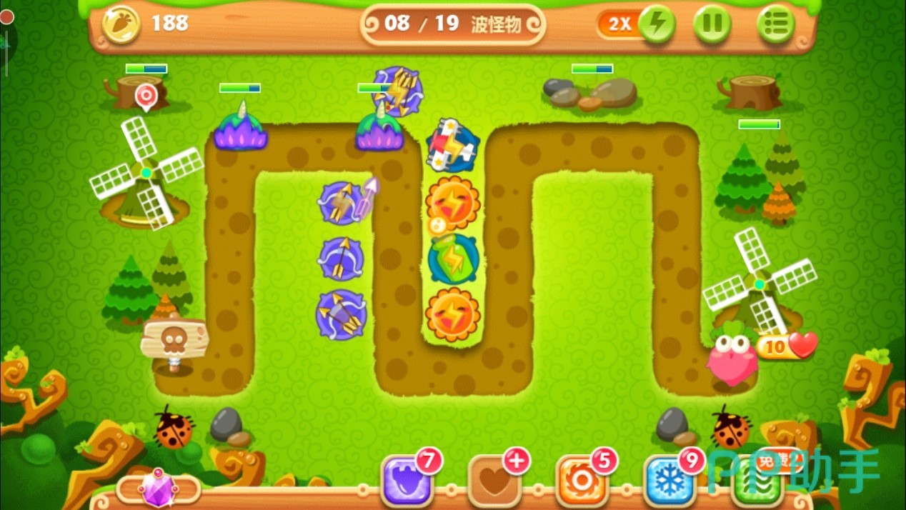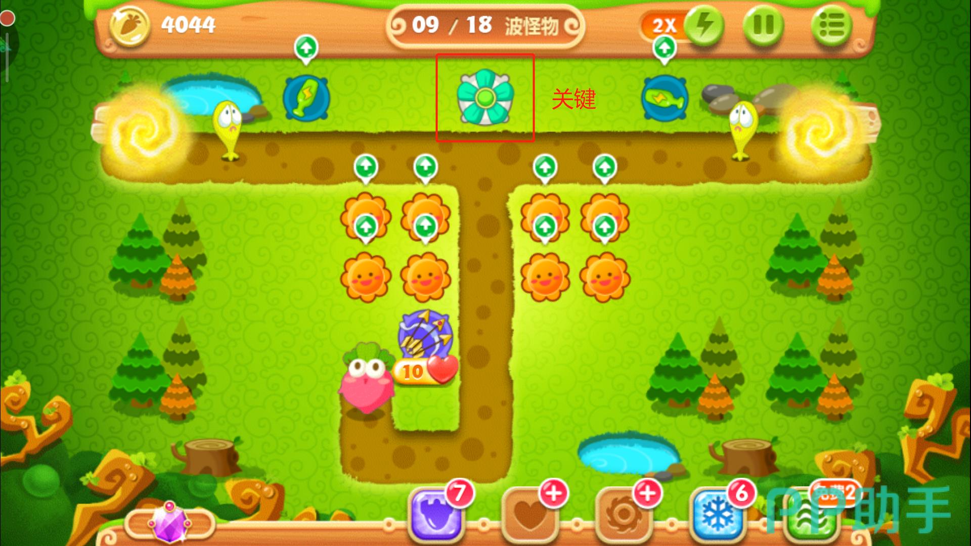 当左侧的风车以及右侧的大松树清掉后,会分别爆出四个魔法球。这里我们不用多想全部卖掉,换成太阳花与月亮的组合,四个空地放好三个太阳花和一个月亮的搭配,有控有输出,月亮就是用来牵制怪物们的全场最佳炮塔,所以要优先升到满级,用剩下的金币把周边太阳花升级即可。