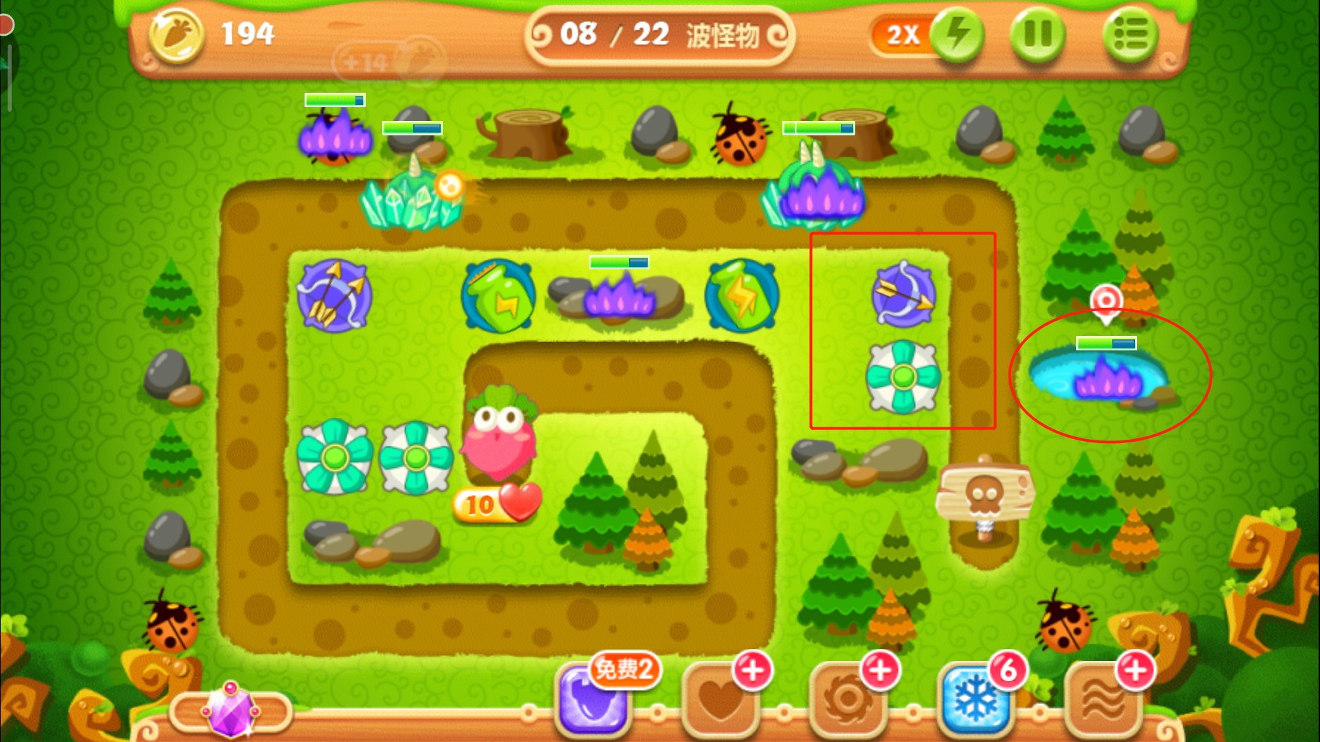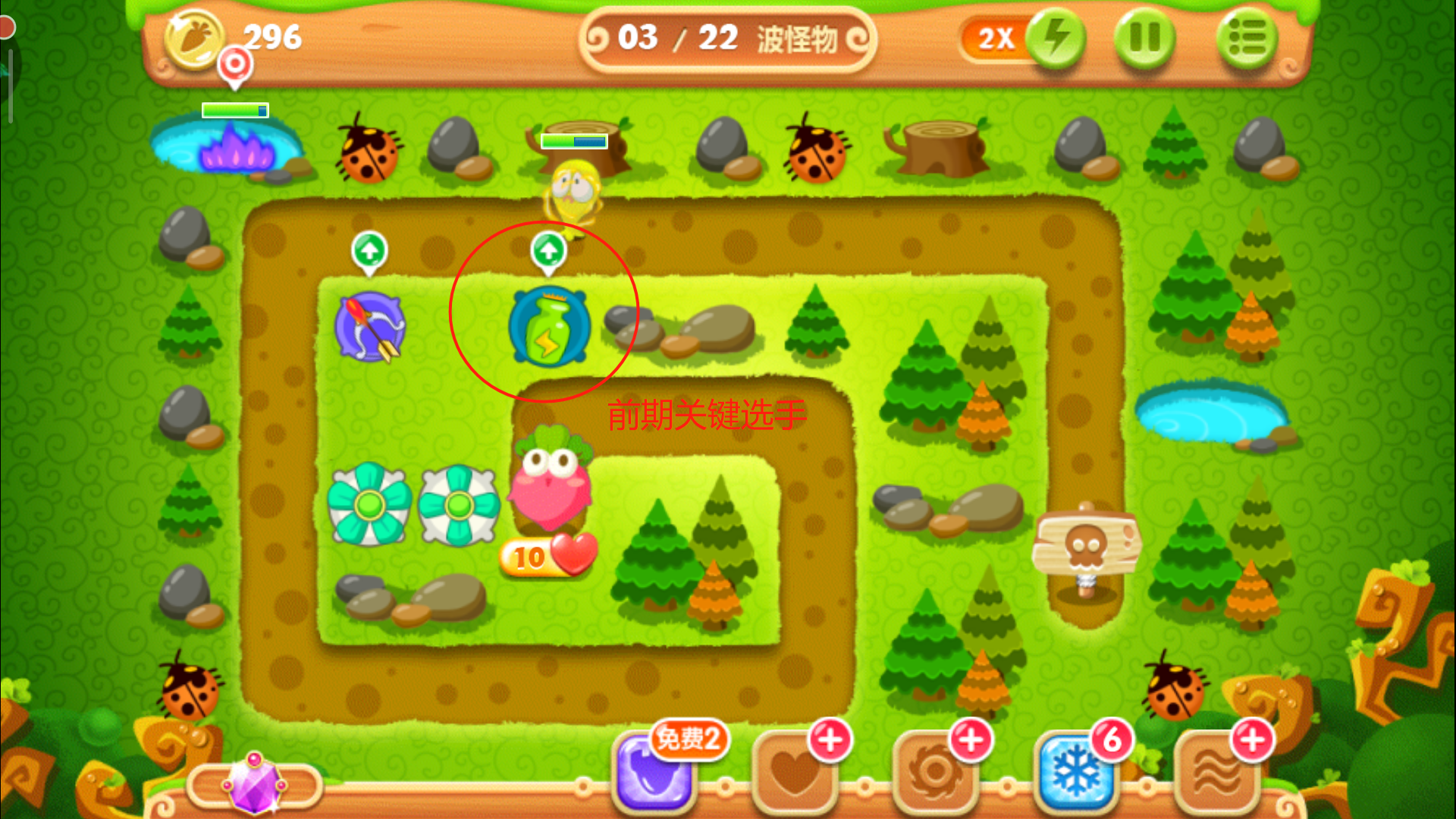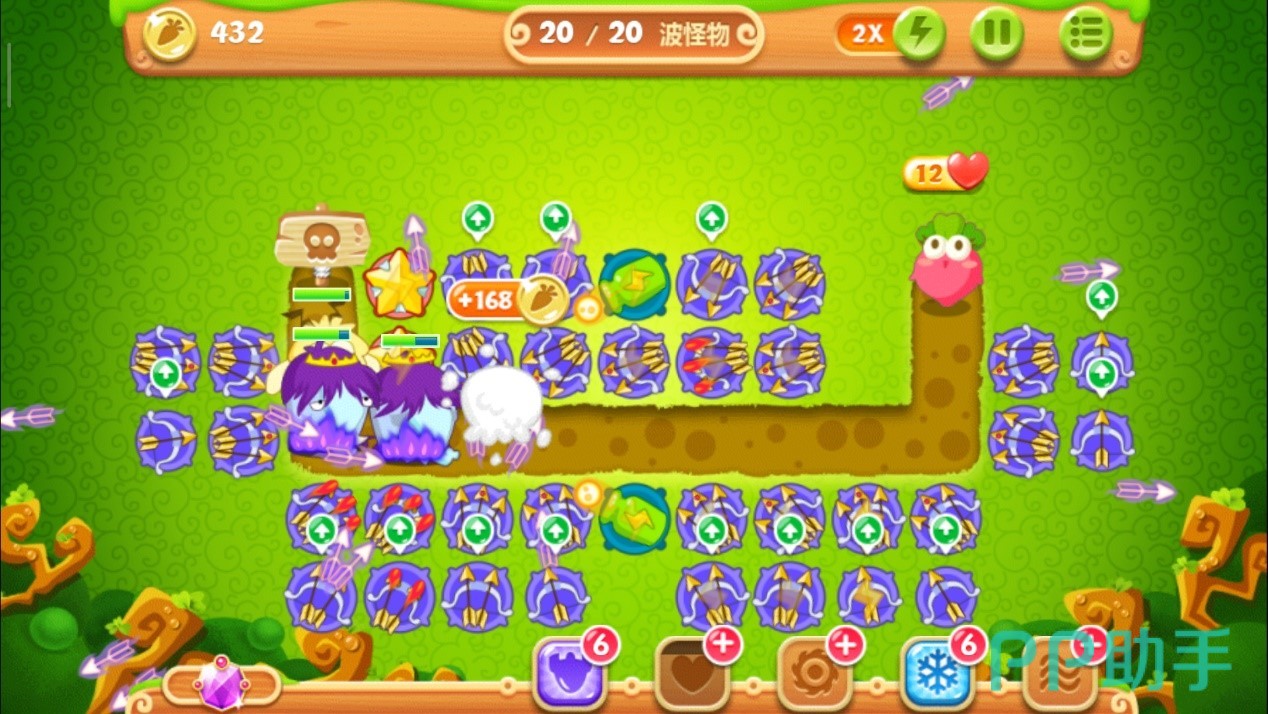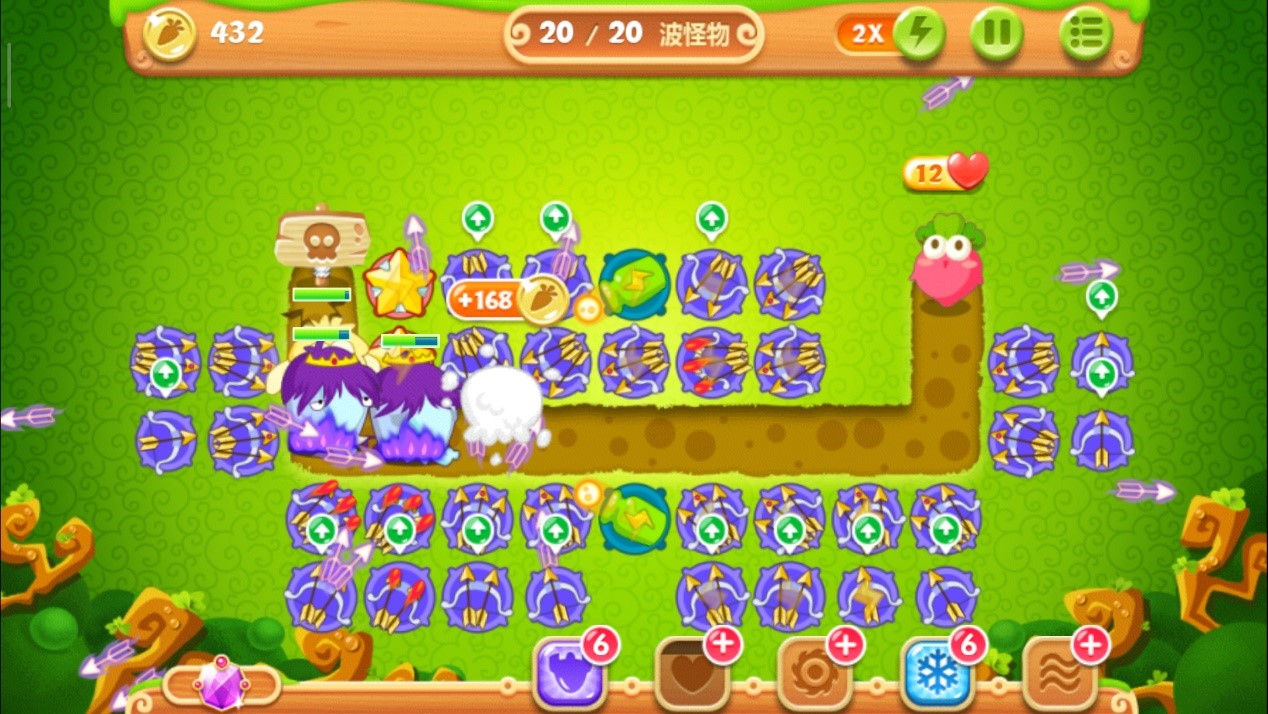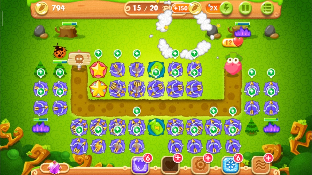 这里一定要把控好时机别玩脱了,否则萝卜被咬就拿不到金牌了。其实在正常情况下,怪物们抵达下路之前松树就会被清除掉,紧接着在左上角空地的位置放下一个多重箭,等这波怪物被消灭后,立刻攻击萝卜上方的障碍物,打破之后我们得到一个瓶子炮。