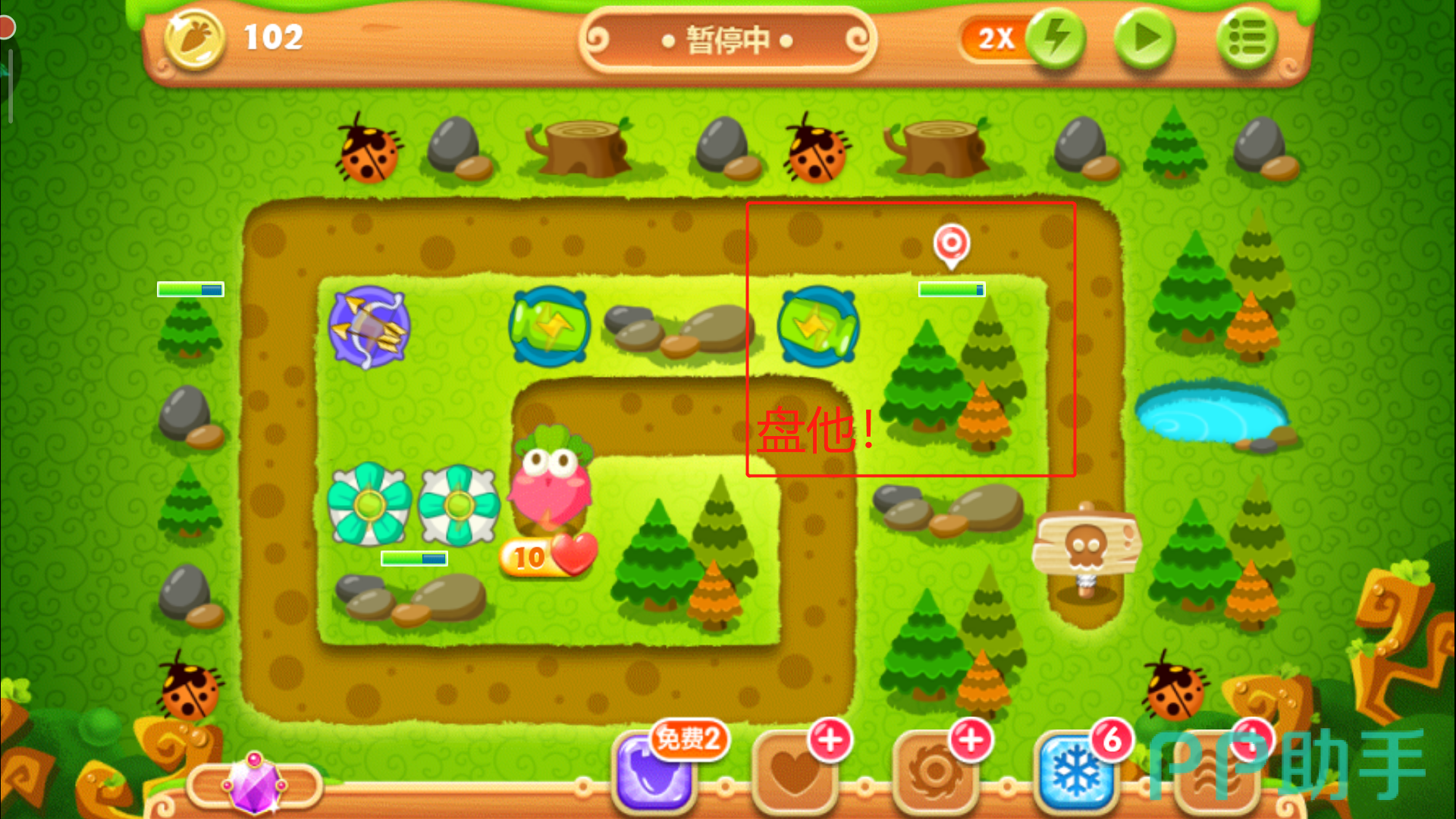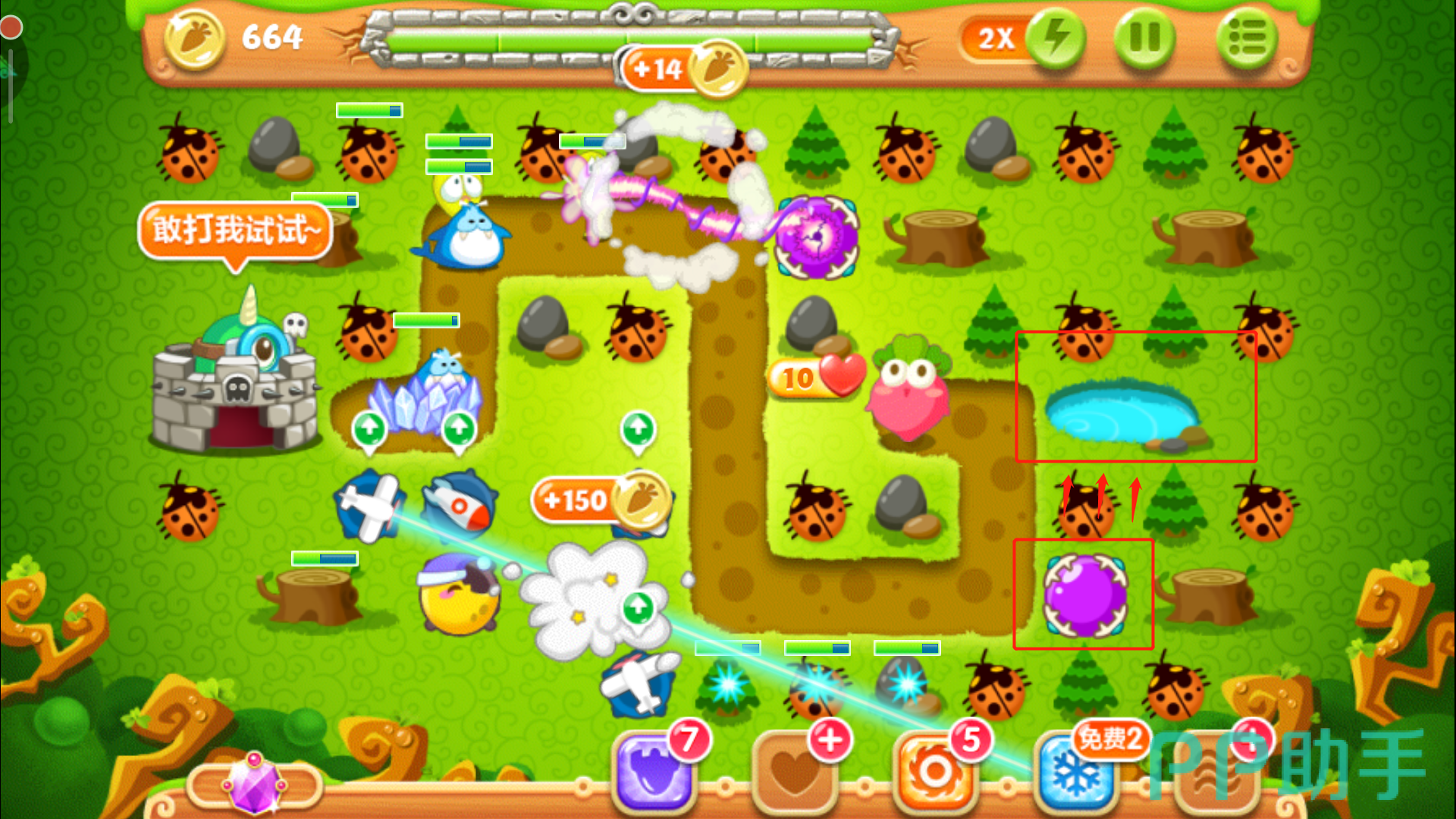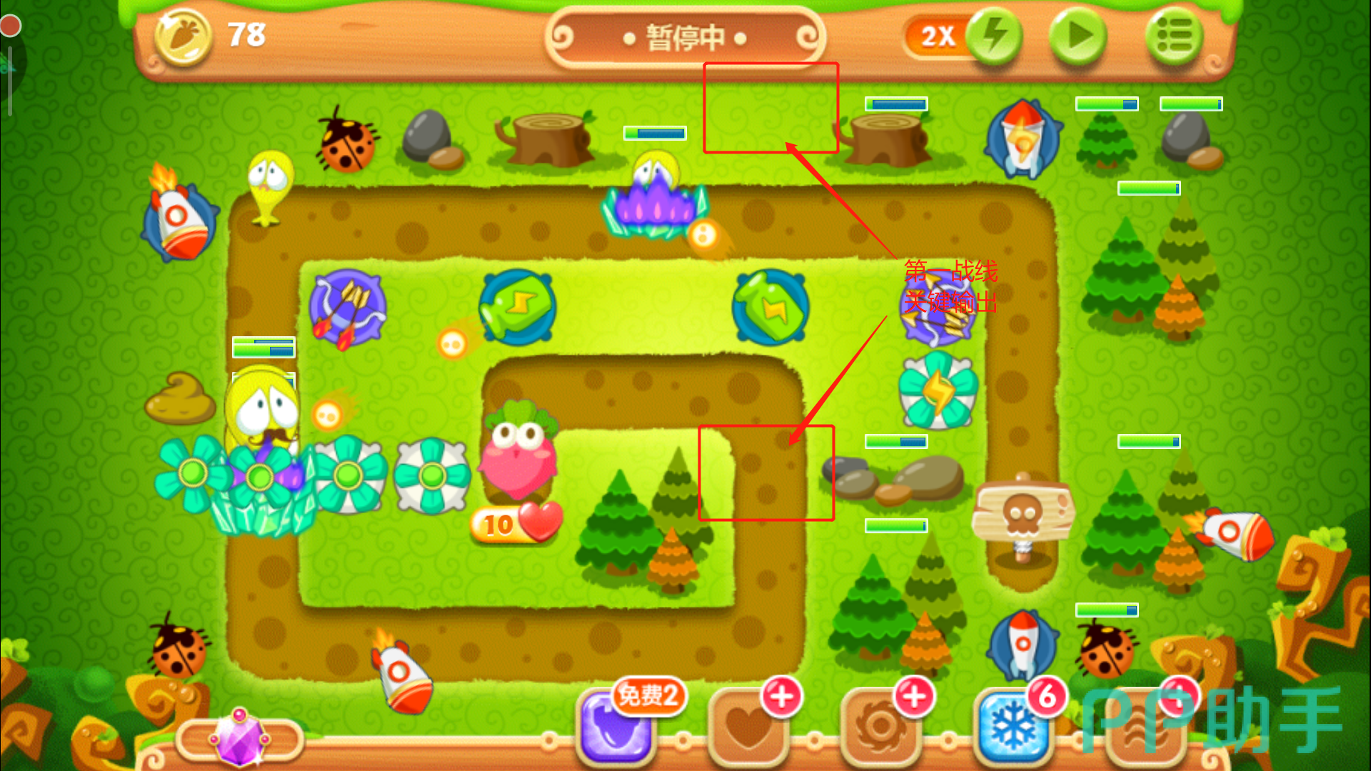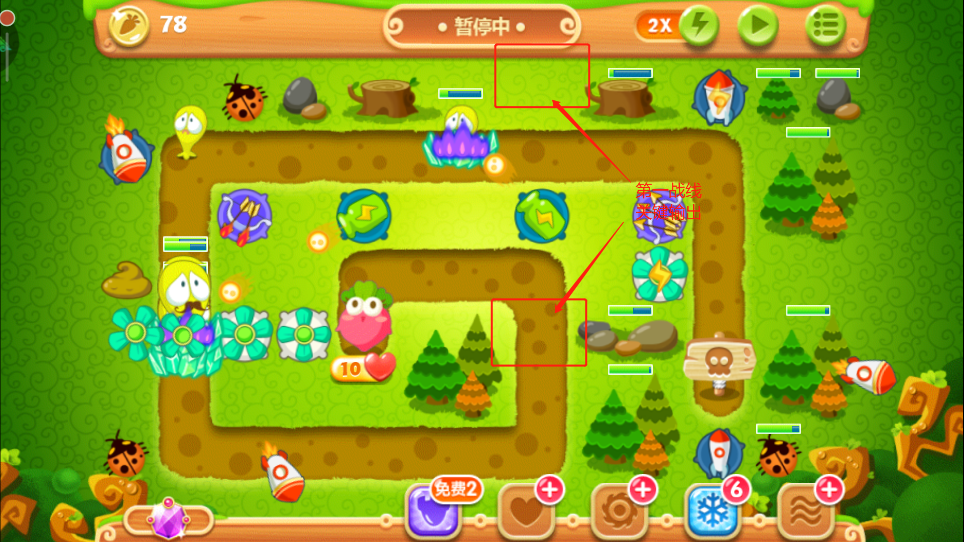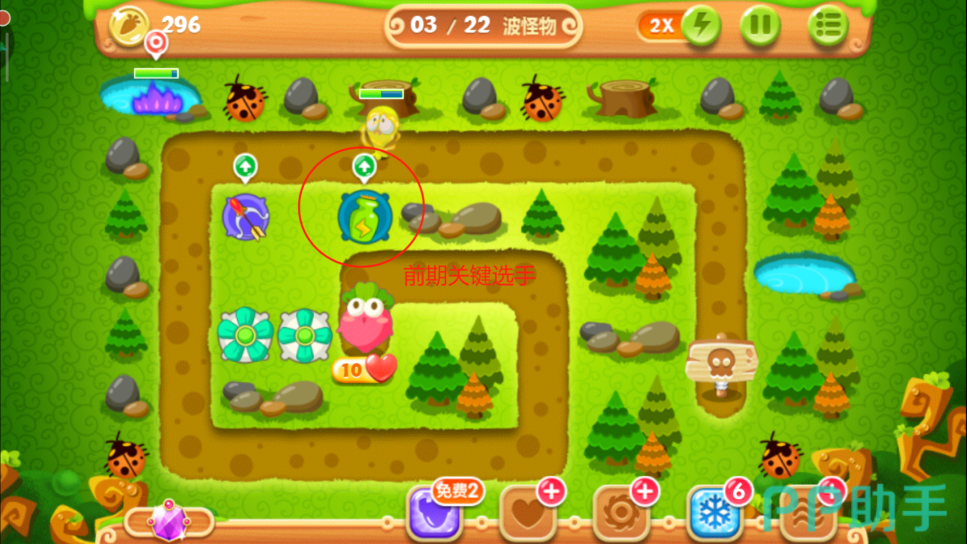 这里一定要把控好时机别玩脱了,否则萝卜被咬就拿不到金牌了。其实在正常情况下,怪物们抵达下路之前松树就会被清除掉,紧接着在左上角空地的位置放下一个多重箭,等这波怪物被消灭后,立刻攻击萝卜上方的障碍物,打破之后我们得到一个瓶子炮。